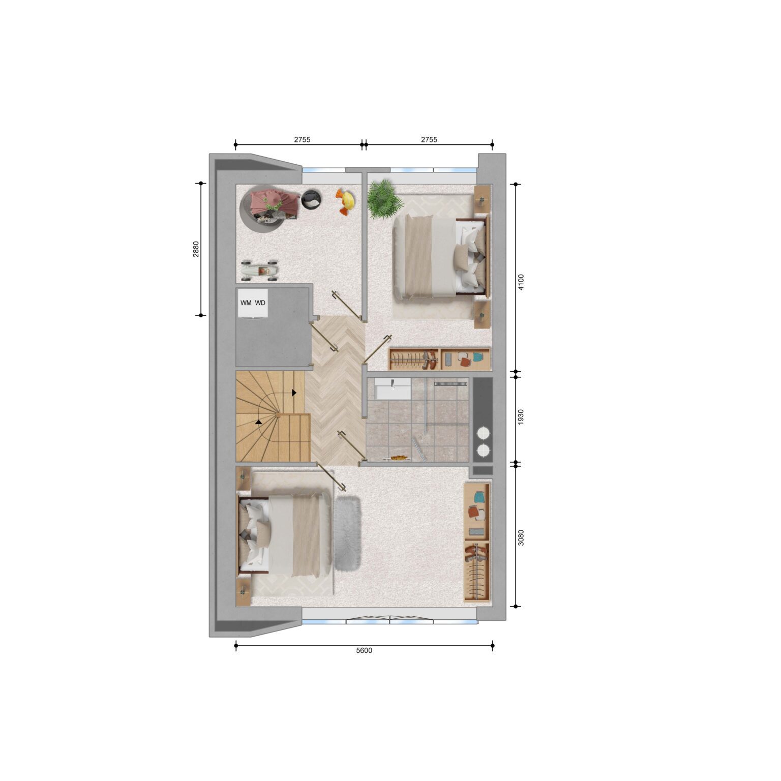 The stairs lead to the second floor. Here you’ll find three well-sized bedrooms and the bathroom. The flat has one bedrooms. The bathroom has a modern finish and is equipped with a walk-in shower and washbasin. There’s also a separate storage room on this floor with connections for a washing machine and dryer.