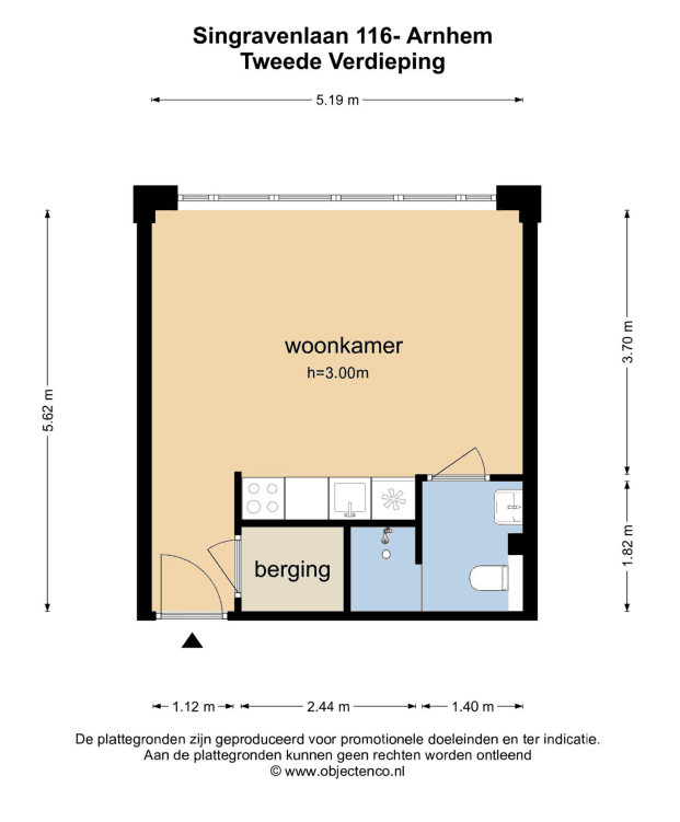 Deze studio is gelegen op de tweede etage. Bij binnenkomst tref je de keuken, voorzien van inbouwapparatuur, en het woon-/slaapgedeelte. De badkamer is voorzien van inloopdouche, wastafel en toilet.