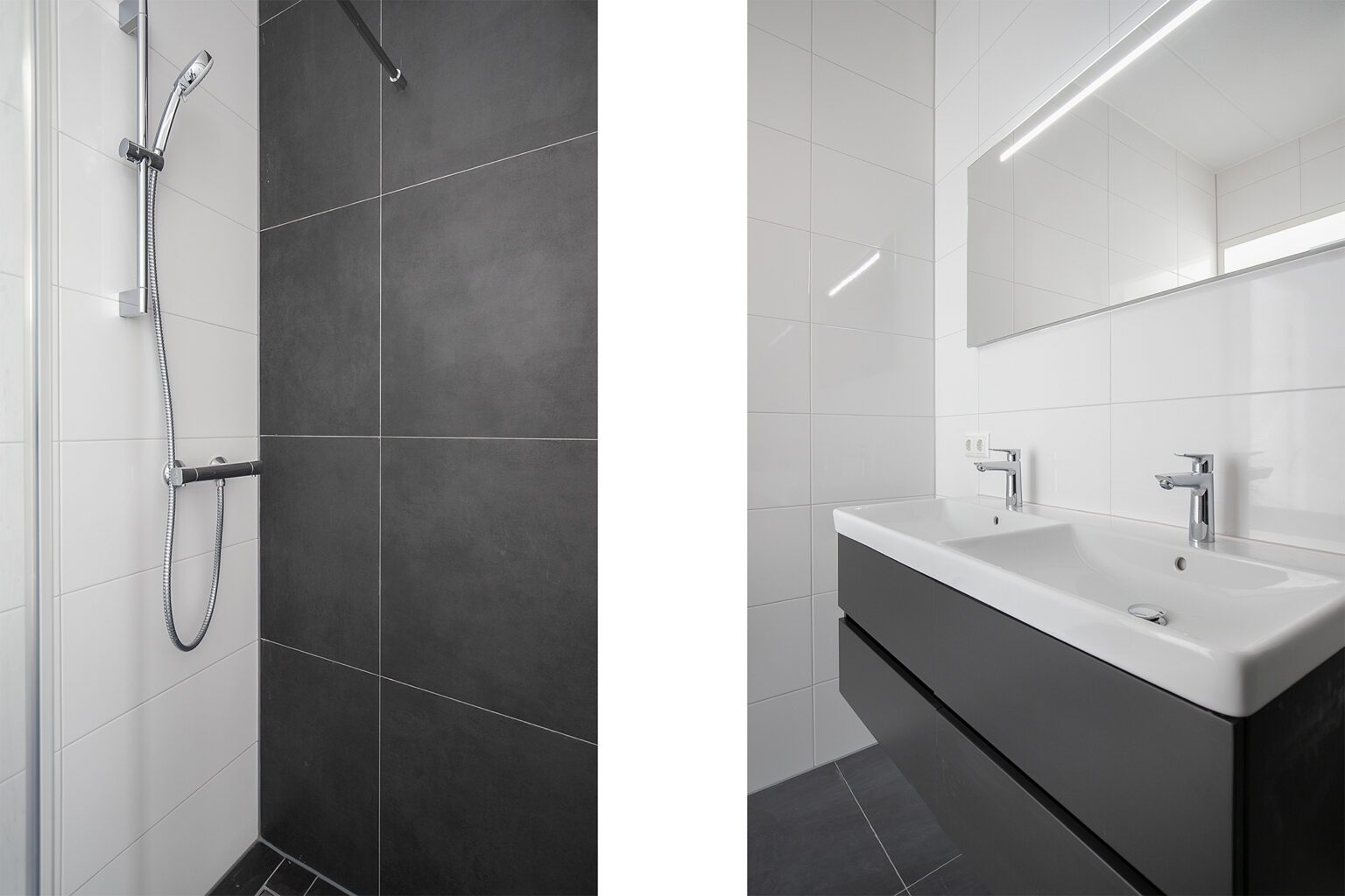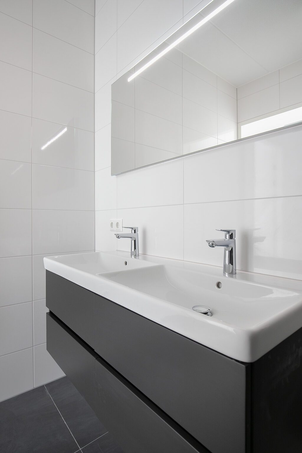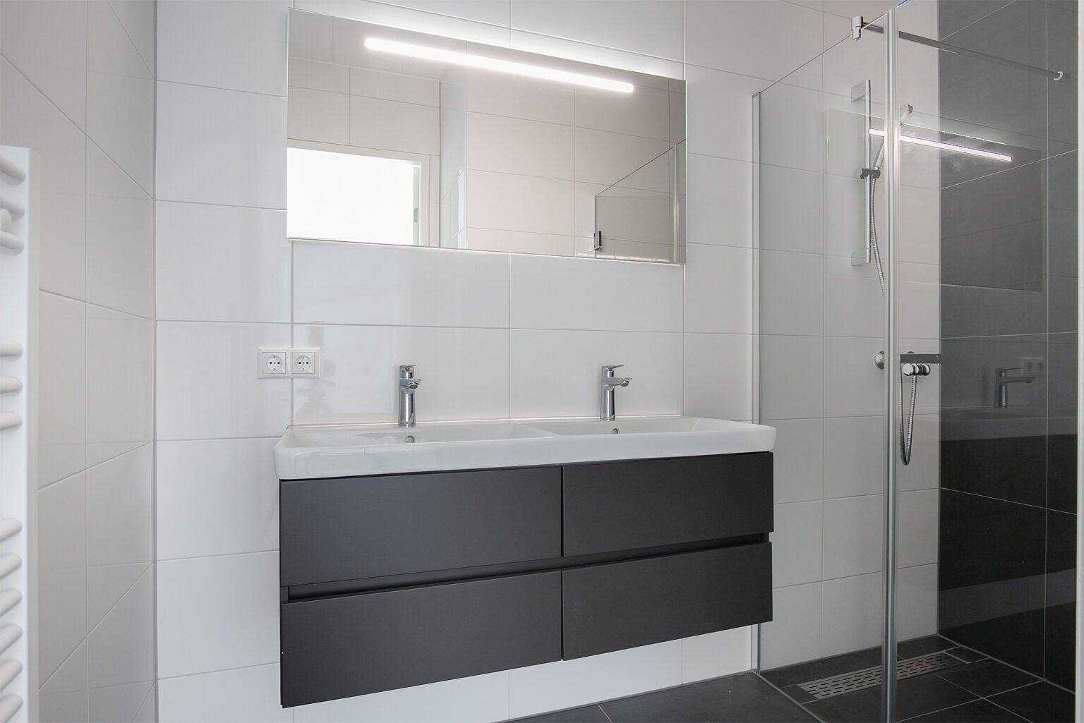 Ook de badkamer is luxe afgewerkt met smaakvol sanitair van Villeroy & Boch. ’s Morgens wakker worden en je tanden poetsen aan de wastafel met onderkast, handig voor het opbergen van toiletspullen. Tijdens een slaperig moment oppassen dat je je voet stoot bij het betreden van de douche? Niet nodig dankzij de inloopdouche met vlakke vloer én moderne drain. Alles oogt daarbij stijlvol en modern – helemaal van deze tijd!
