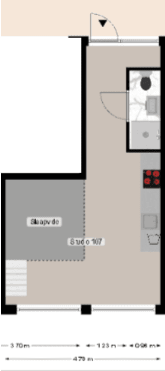 De studio is efficiënt ingedeeld en biedt een comfortabele leefruimte. De moderne keuken is voorzien van een vaatwasser, kookplaat, afzuigkap en aansluitingen voor een wasmachine, zodat alles wat je nodig hebt binnen handbereik is. De compacte badkamer is volledig uitgerust met douche, toilet en wastafel.