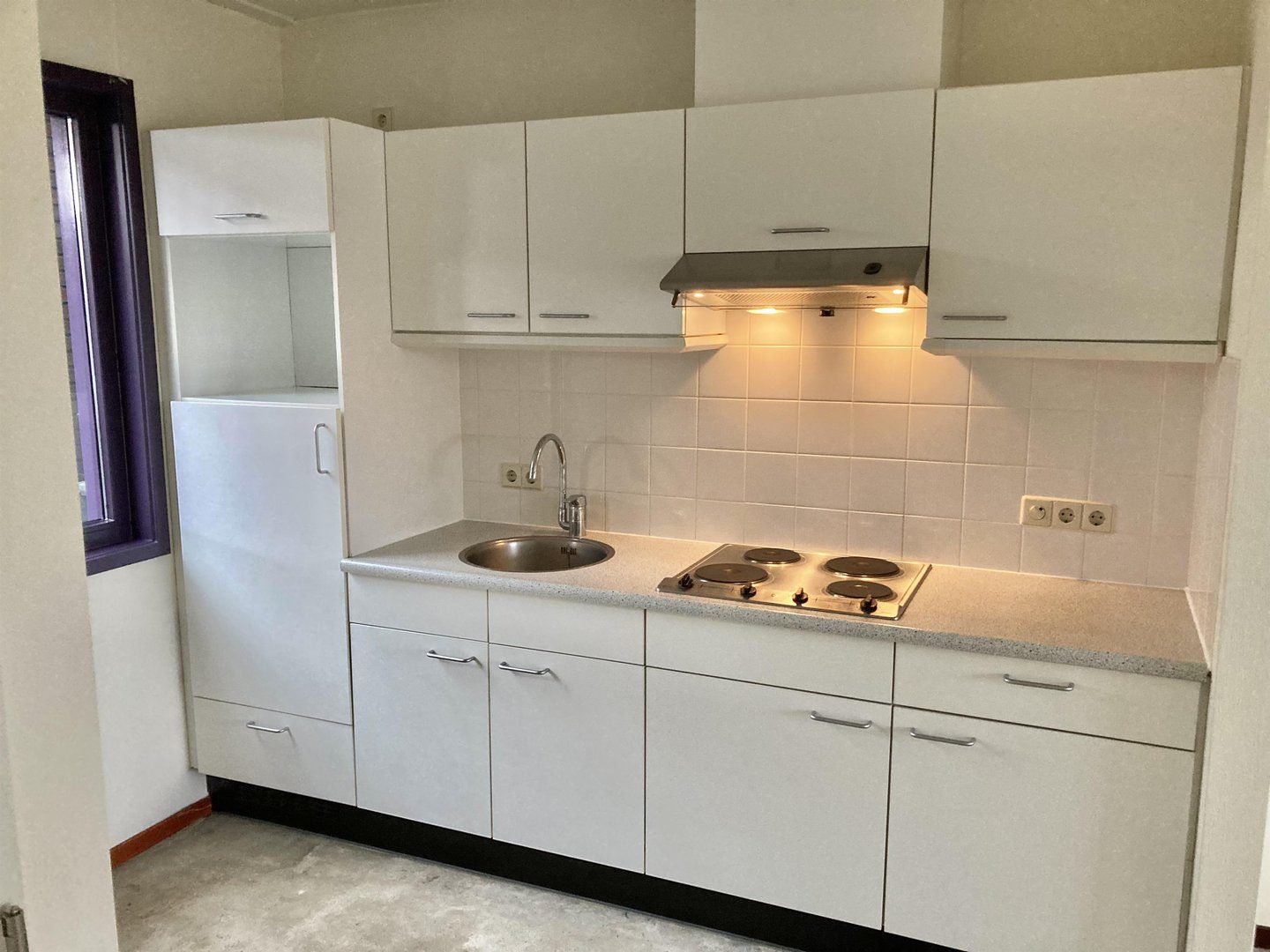 Wanneer je rechtdoor loopt kom je in ruime en zonnige woonkamer open keuken. De keuken met kookgedeelte en koelkast bevindt zich aan de voorzijde van de woning.