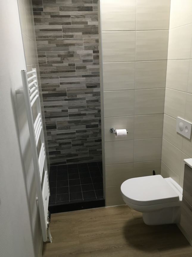 De badkamer is volledig betegeld en voorzien van een wastafelmeubel, hangtoilet, inloopdouche en handdoekradiator. Er is een aparte berging met een aansluiting voor de wasmachine.