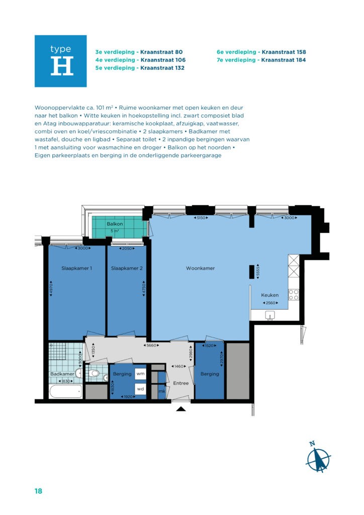 In de hal vindt u de meterkast, berging en de toiletruimte. Vanuit de hal betreedt u de ruime woonkamer met open keuken en deur naar het balkon (westen). De keuken is voorzien van luxe Siemens inbouwapparatuur zoals een keramische kookplaat, afzuigkap, vaatwasser, combi oven en koel/vriescombinatie. De badkamer is voorzien van wastafel, douche en ligbad. Het appartement beschikt over 2 slaapkamers waarvan er één toegang heeft tot het balkon.