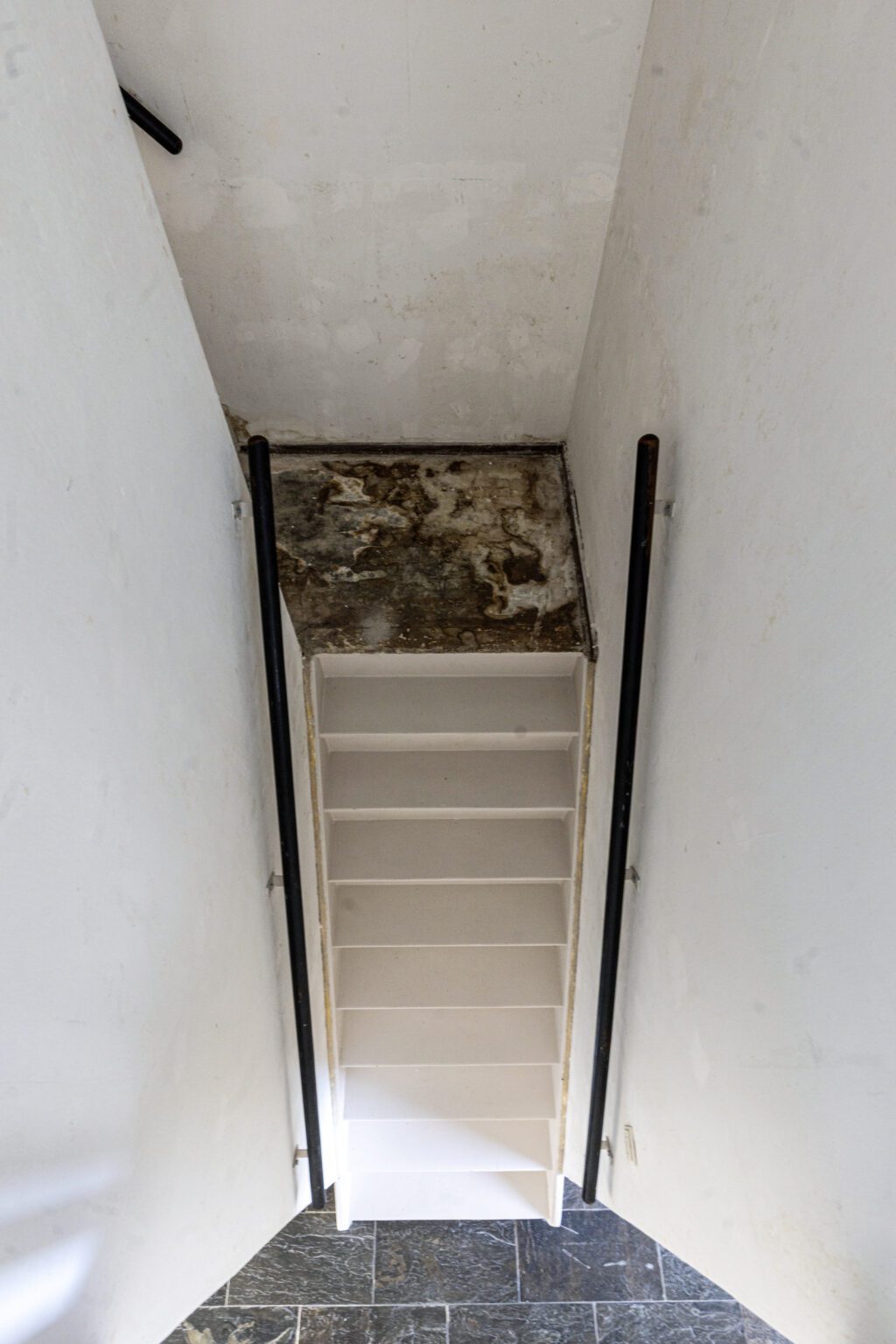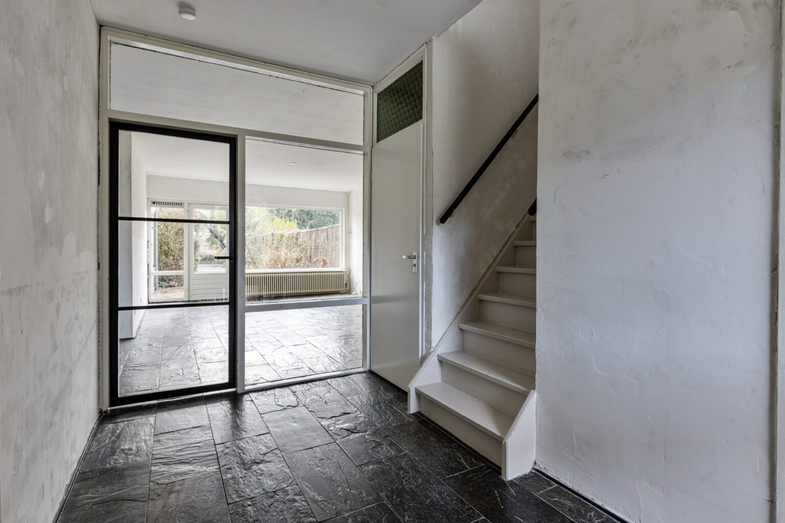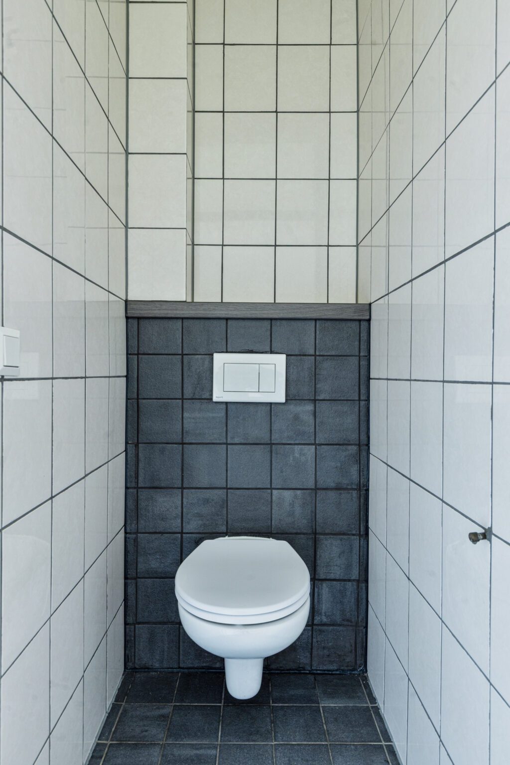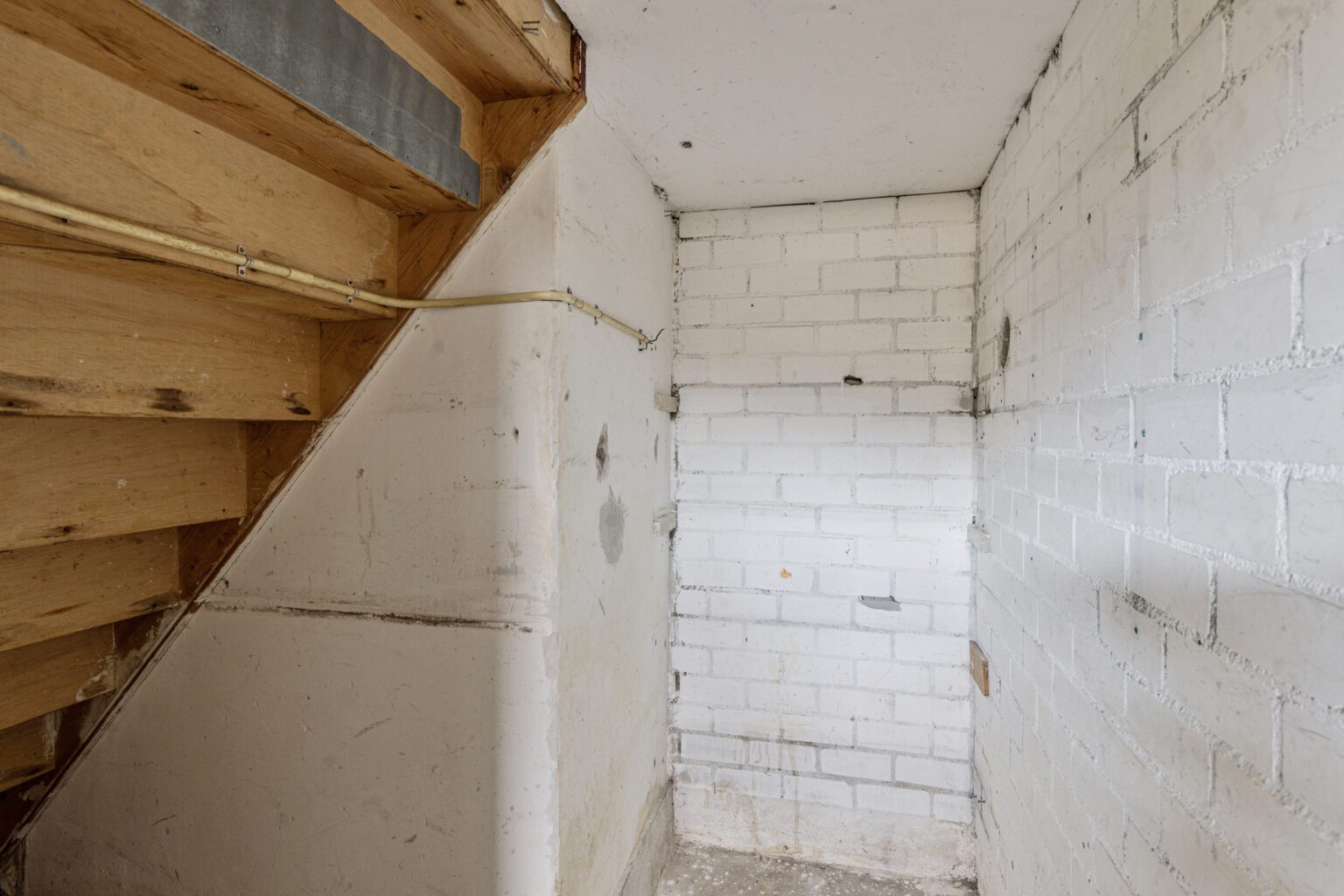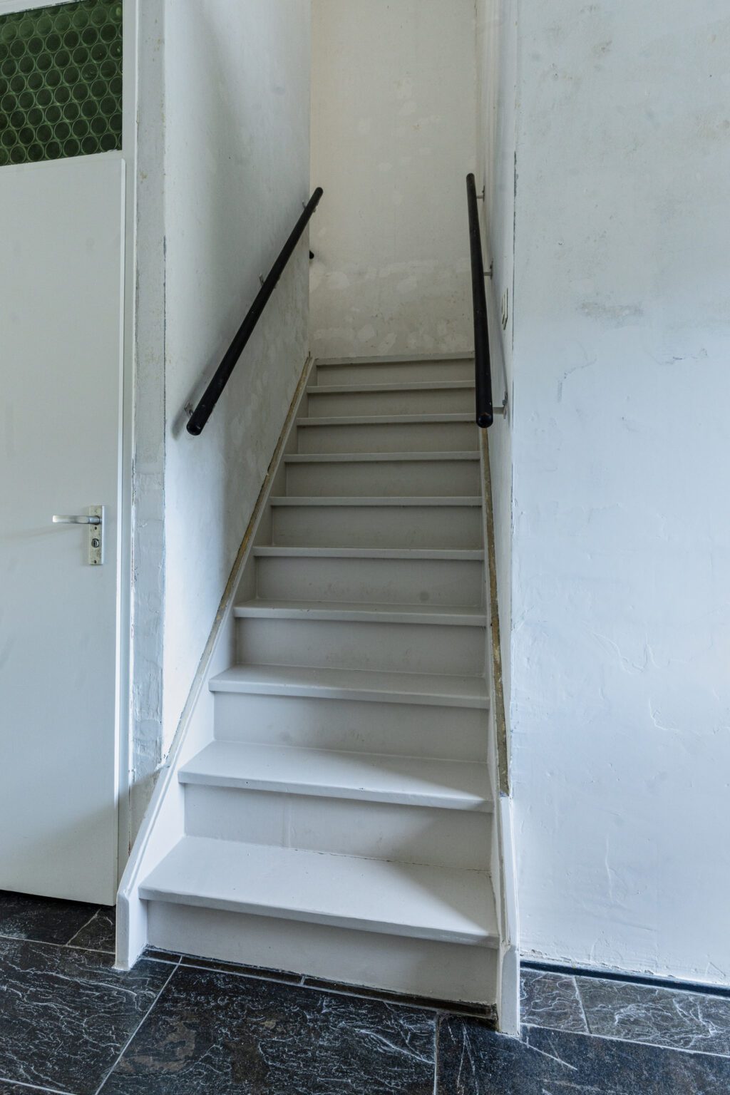 Naast de beging bevindt zich het toilet met wandcloset. De trapopgang is een architectonisch element op zich, met een speelse draai, tussenplateau en balustrade op de verdieping. De trap loopt als het ware rondom de twee separate toiletten en geeft de woning een uniek karakter.