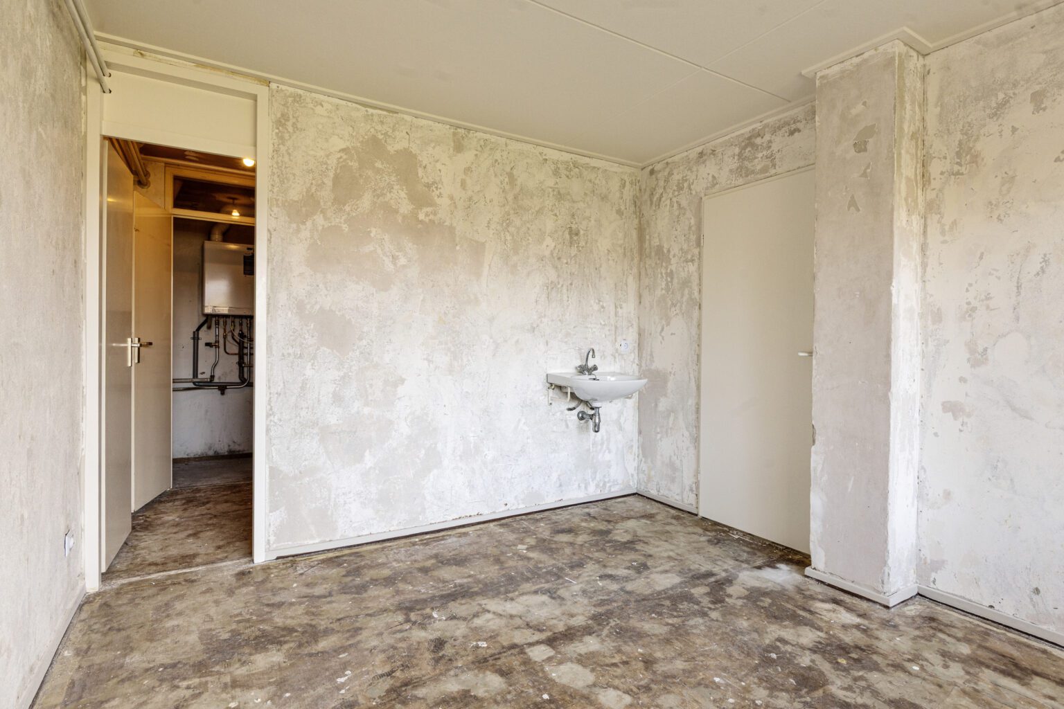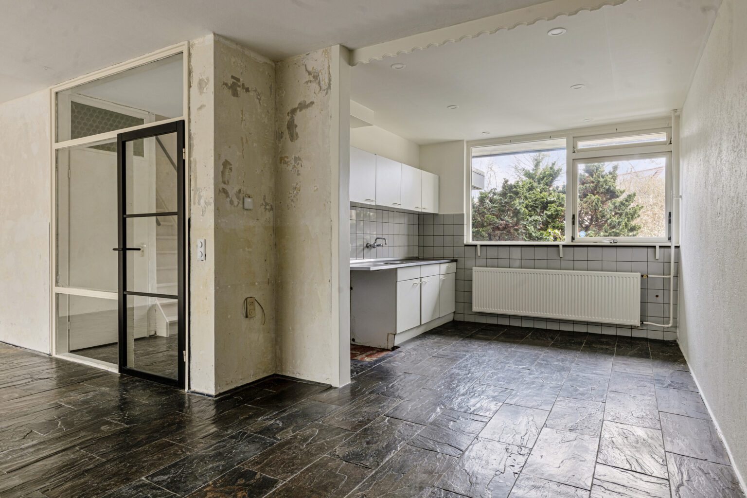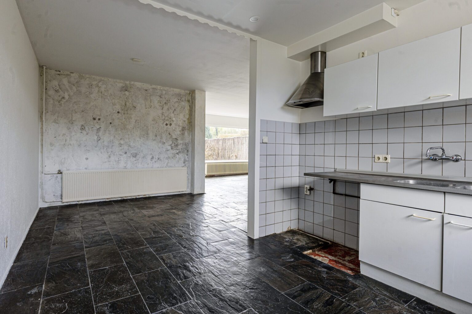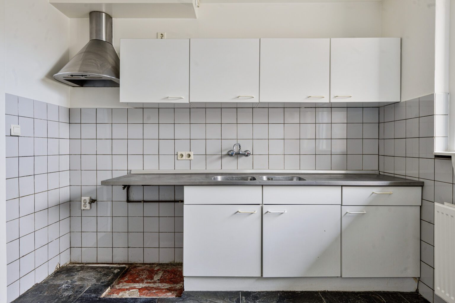 De keuken bevindt zich aan de voorzijde van de woning en biedt vrij uitzicht over de straat en de groenstrook. De huidige keuken is functioneel, maar er is voldoende ruimte om deze geheel naar eigen wens te vernieuwen. Of je nu kiest voor een royale kastenwand, een kookeiland of een gezellige eetbar: de mogelijkheden zijn hier ruim aanwezig.