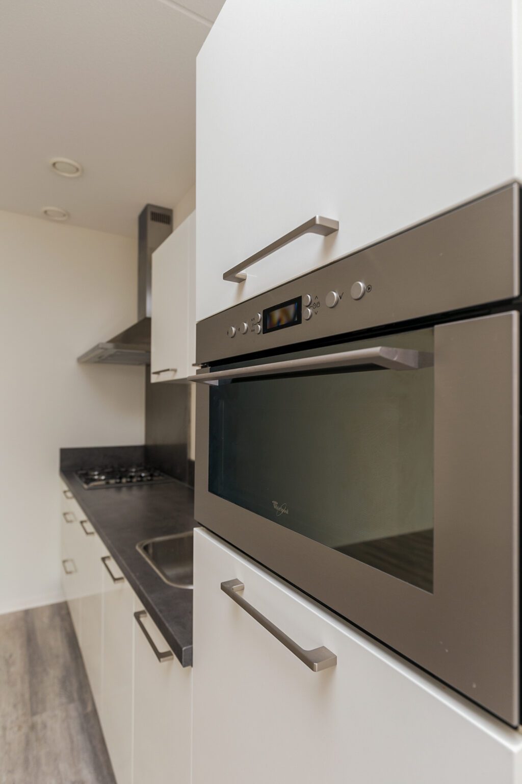Moderne keuken in witte kleurstelling met antraciet werkblad, voorzien van Whirlpool inbouwapparatuur: