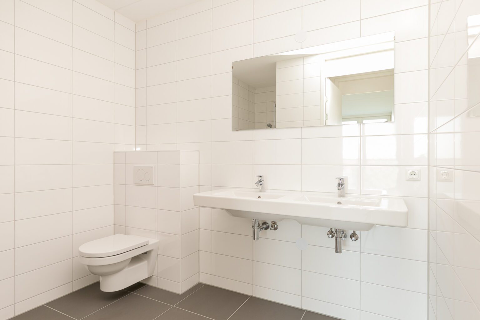Volledig betegelde badkamer met A-merk sanitair (Sphinx, Villeroy & Boch en Grohe), voorzien van: