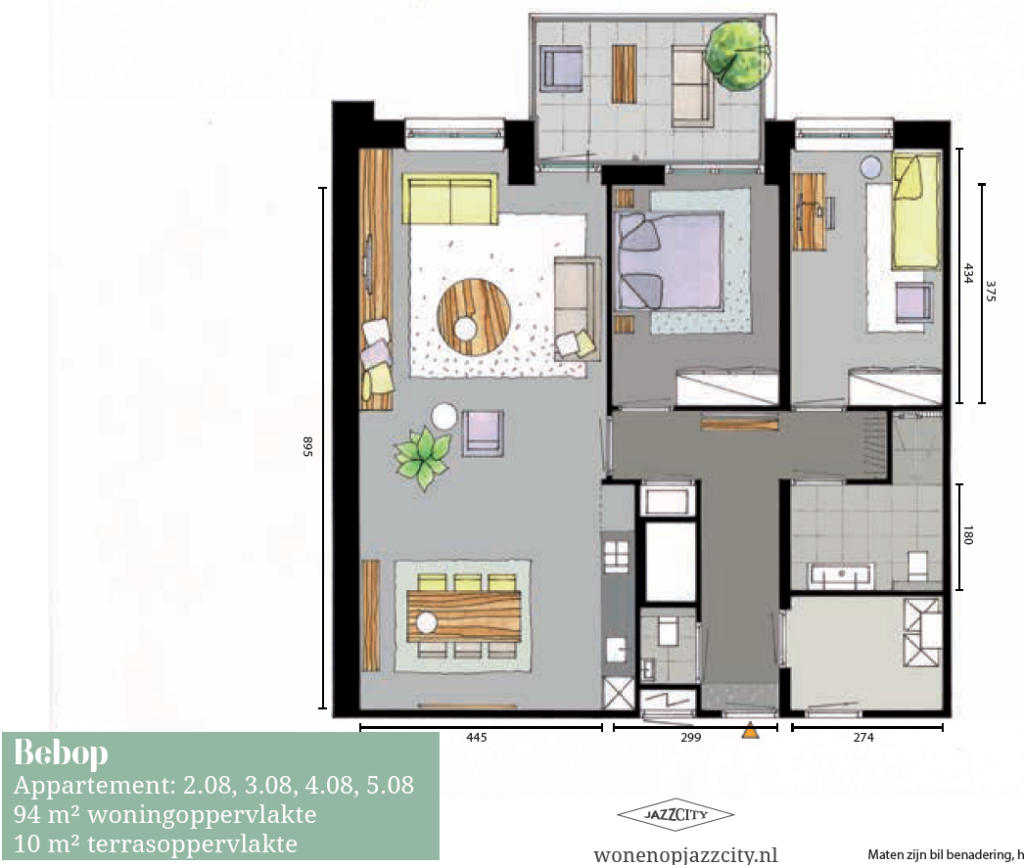 Dit appartement (type Bebop 4-08) ligt aan de maaszijde op de 4e verdieping en heeft een woonoppervlakte van circa 94 m².