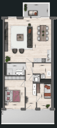 The apartment also has 2 bedrooms, a bathroom with shower and double sink, and a separate toilet. The separate storage room with space for both a washing machine and dryer is practical.