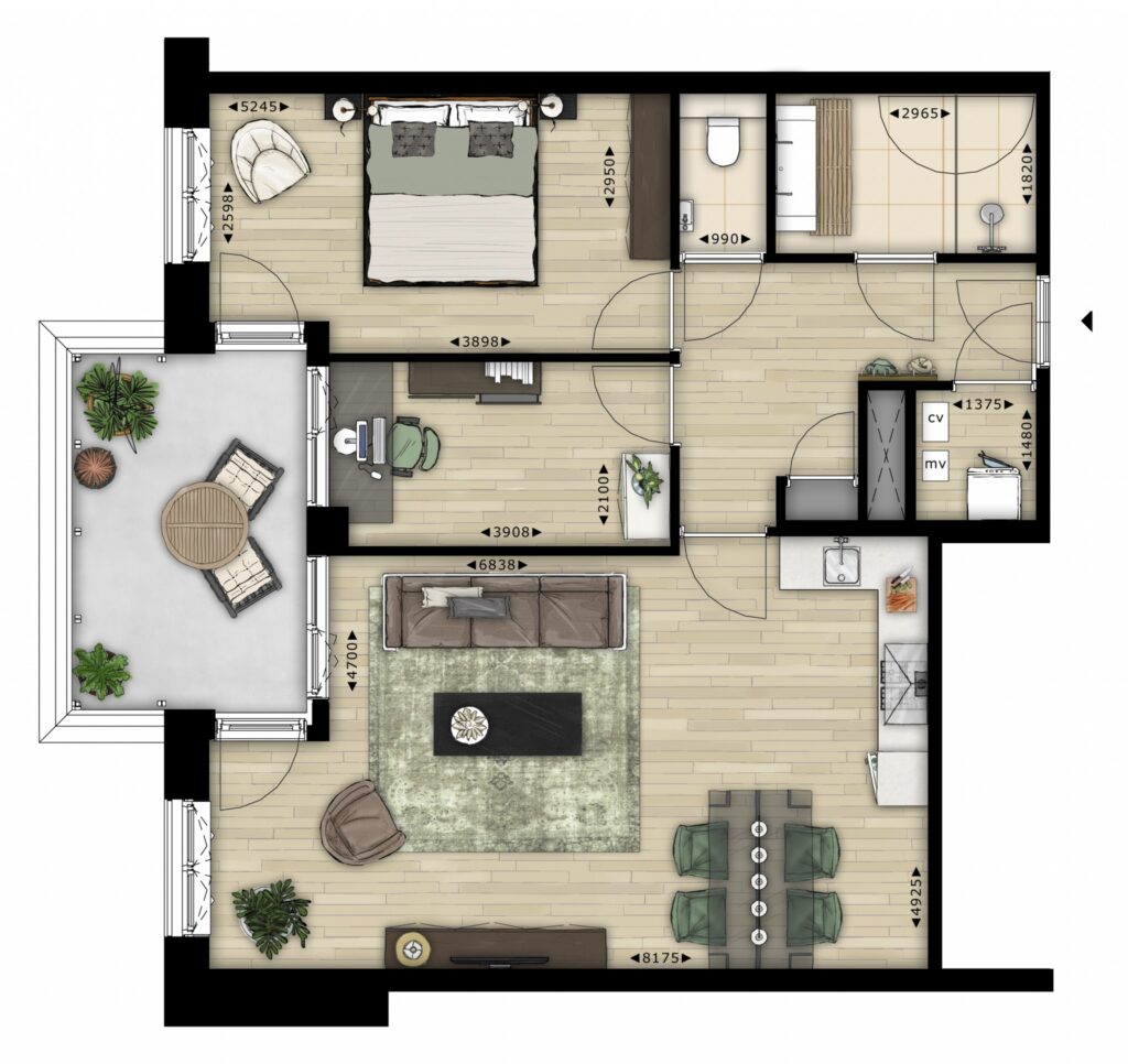 De woning van 80 m2 is voorzien van een fijne woonkamer met open keuken. De open keuken is voorzien van inbouwapparatuur, zoals kookplaat, afzuigkap, koelkast met vriezer. Vanuit de woonkamer heb je toegang tot het balkon.