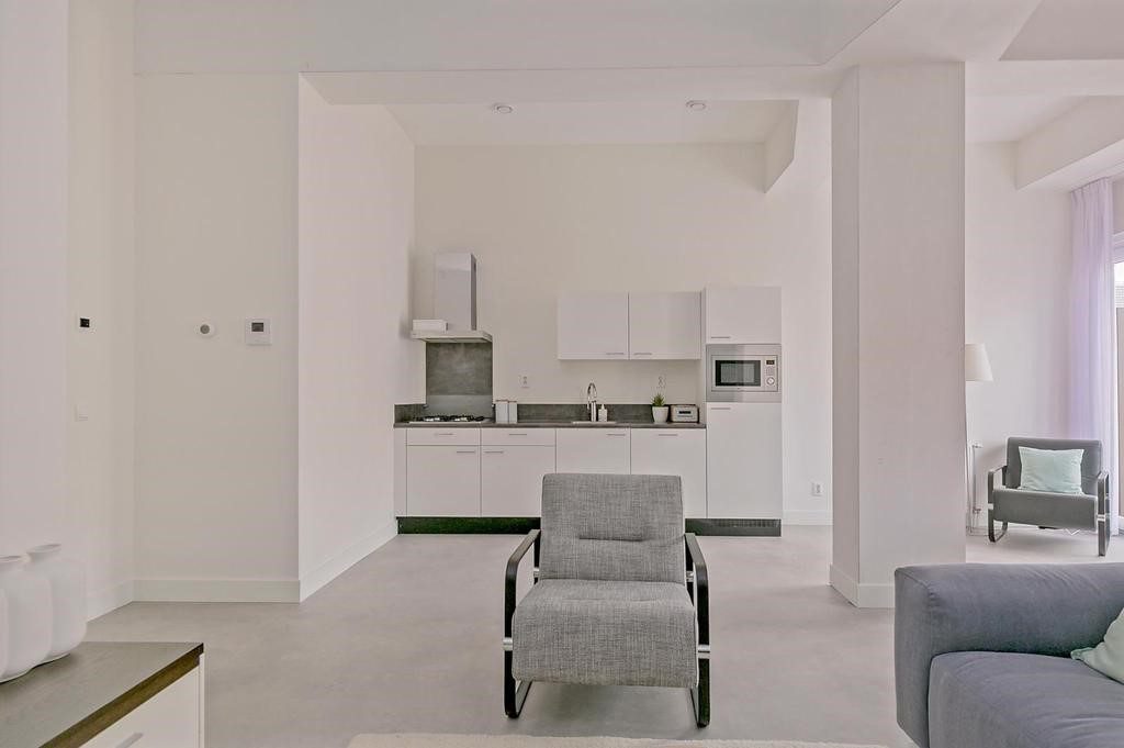 • Woonkamer met open keuken voorzien van afzuigkap op recirculatiefilters, 4–pits gaskookplaat, koel -vriescombinatie, vaatwasser en combi oven magnetron.