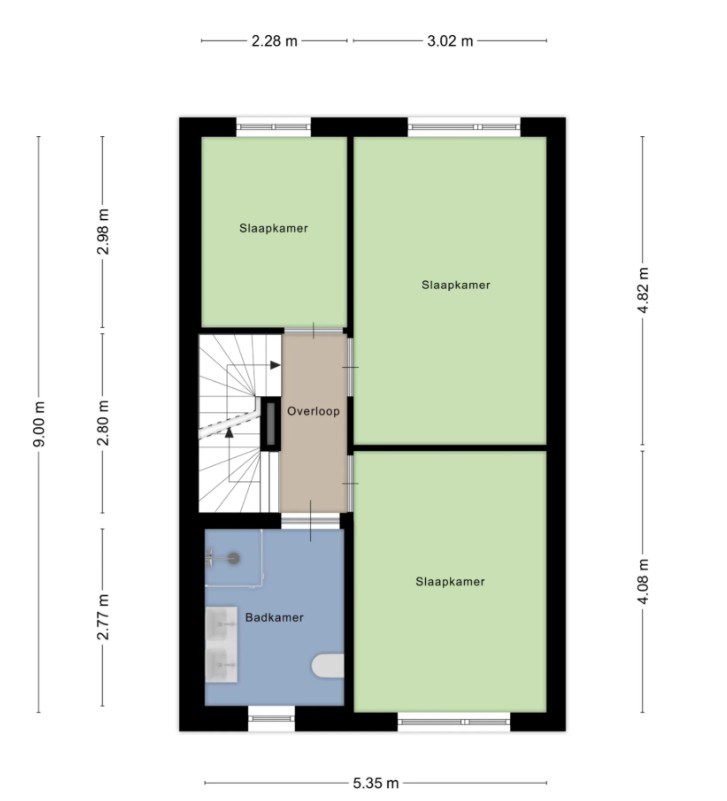 Eerste verdieping: Overloop, drie slaapkamers en een moderne badkamer met inloopdouche, tweede toilet, wastafelmeubel en designradiator. Ook deze verdieping is voorzien van vloerverwarming en een pvc-vloer.