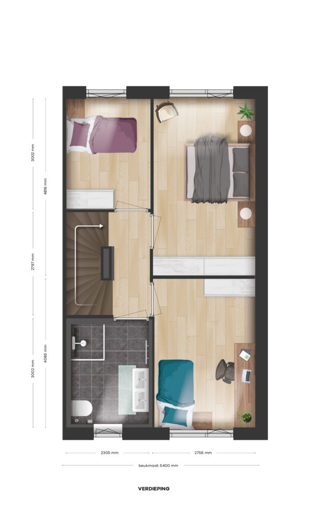 Op de eerste verdieping zijn 3 ruime slaapkamers. Net als op de begane grond geniet je hier van behaaglijke vloerverwarming. De ruime badkamer is voorzien een douche, dubbele wastafel met wastafelmeubel en 2e toilet.