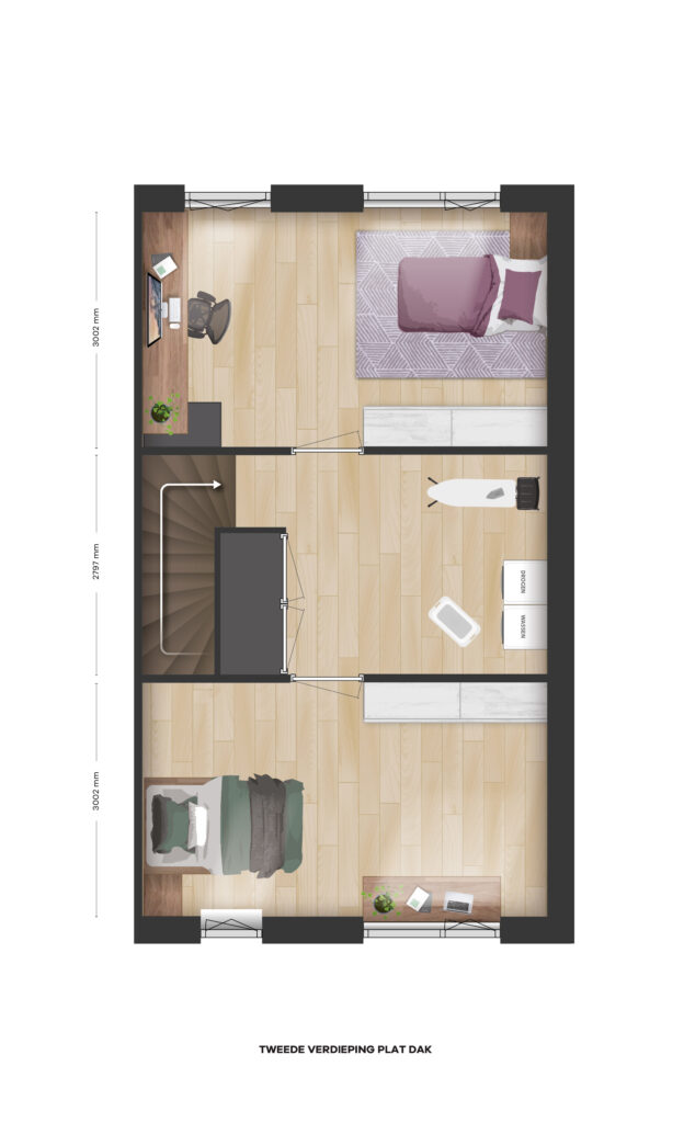 Via een vaste trap bereik je de ruime zolder voorzien van wasmachineaansluiting. Op deze verdieping is een centrale kastruimte met deuren geplaatst, waarin de warmtepomp en omvormer voor de zonnepanelen zich bevinden. Er zijn twee goed formaat lichte slaapkamers op deze verdieping.