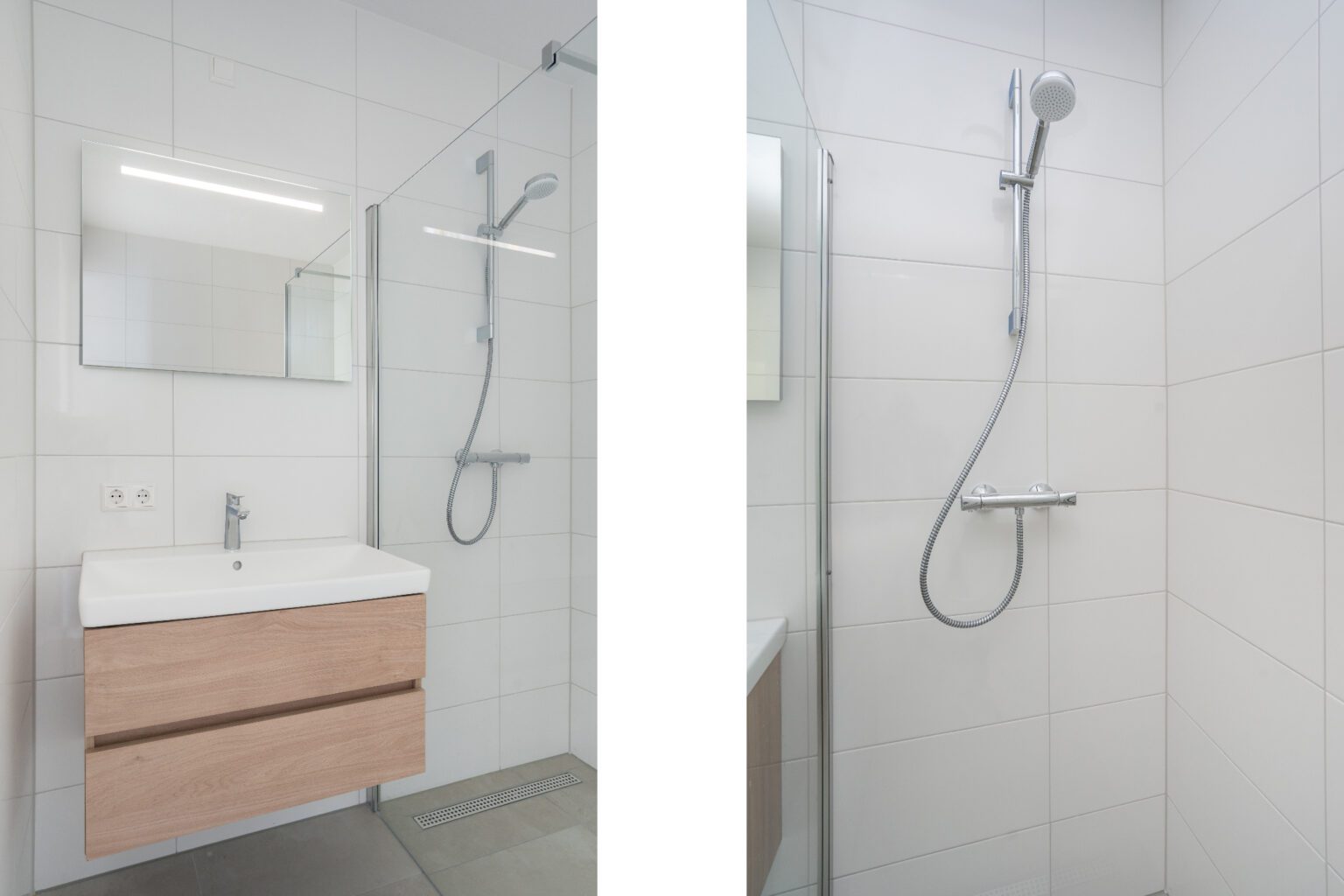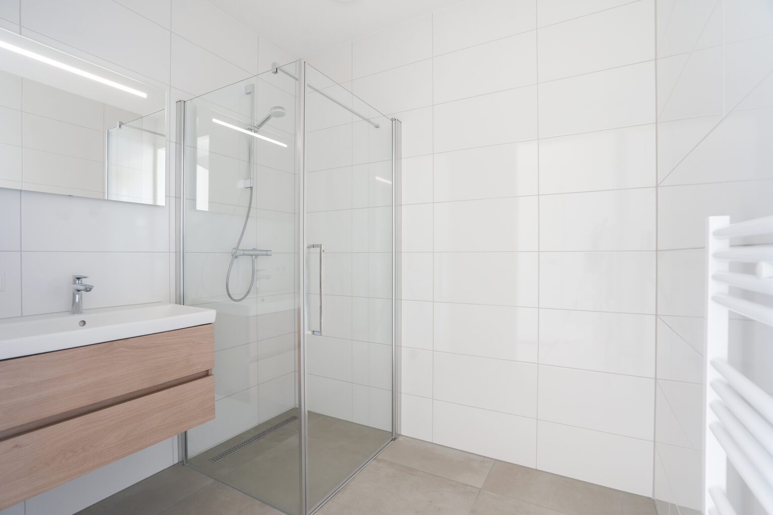 The apartment has a good-sized bedroom. The bathroom is modern and equipped with a walk-in shower and double sink, and there is a separate toilet. Extra convenient: a separate room for the washing machine and dryer, an internal storage room, and an external storage room for bicycles or extra storage, for example.