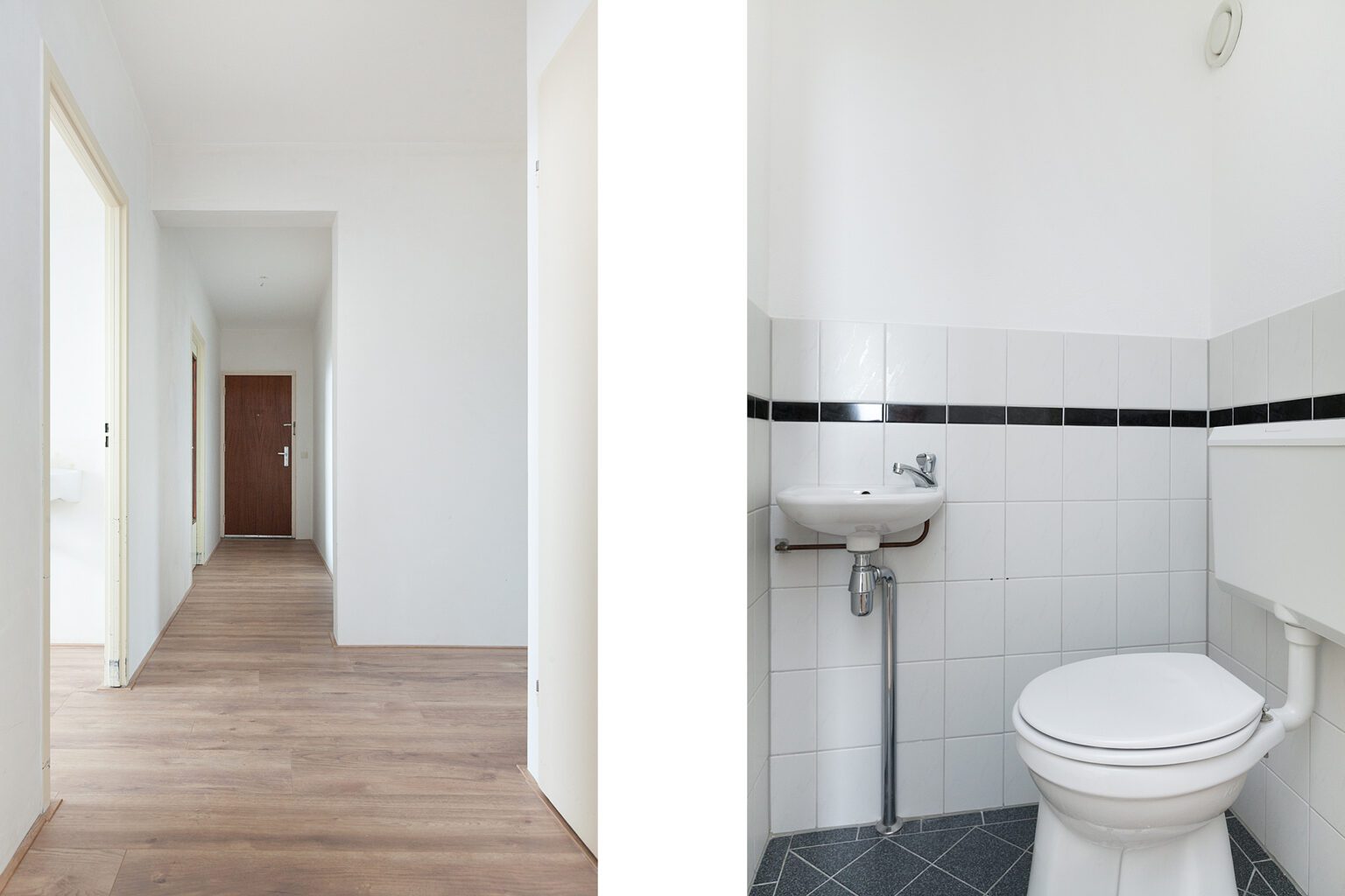 Woonkeuken voorzien van keukenblok met een gaskookplaat en afzuigkap. De woning heeft een separaat toilet met fonteintje, badkamer voorzien van douche en bad, wastafel en 2e toilet, bijkeuken met veel bergruimte en aansluiting voor de wasmachine. Ruime woonkamer met toegang tot het balkon, met een fraai uitzicht op het park.