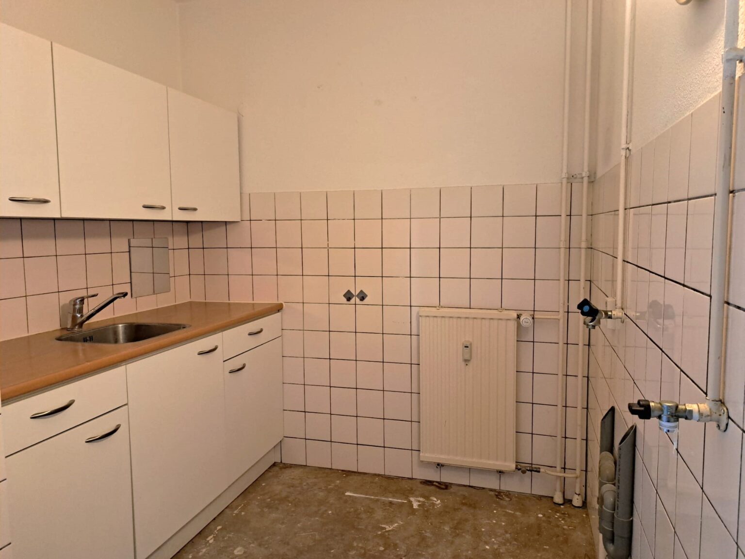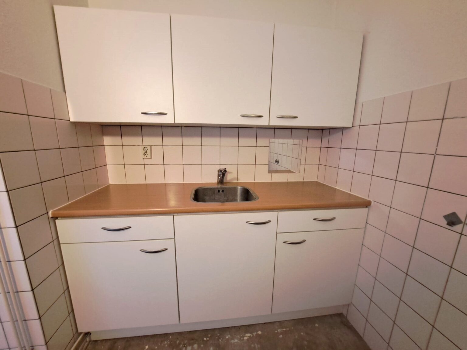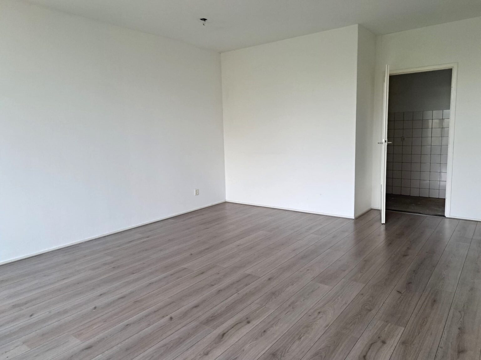 De keuken, direct achter de woonkamer, biedt voldoende ruimte voor een praktische keukenopstelling. De ingebouwde kasten zorgen ervoor dat je al je keukengerei en voorraad netjes kunt opbergen, terwijl je toch alles binnen handbereik hebt. Doordat de keuken achter een muur is geplaatst, hoeven je gasten geen vieze mokjes of keukengerei op het aanrecht te zien staan.