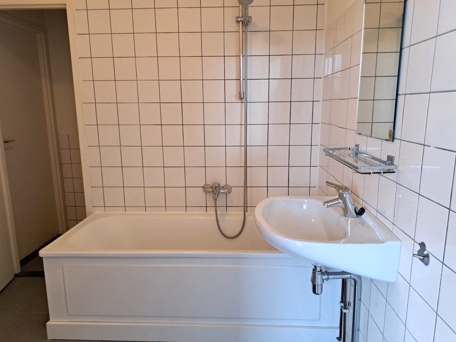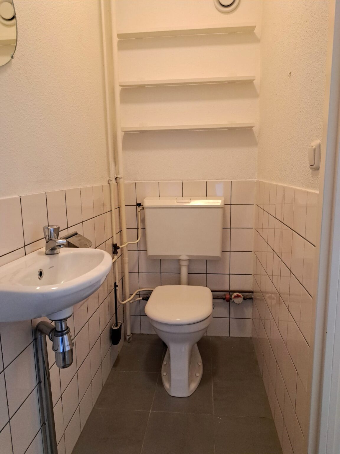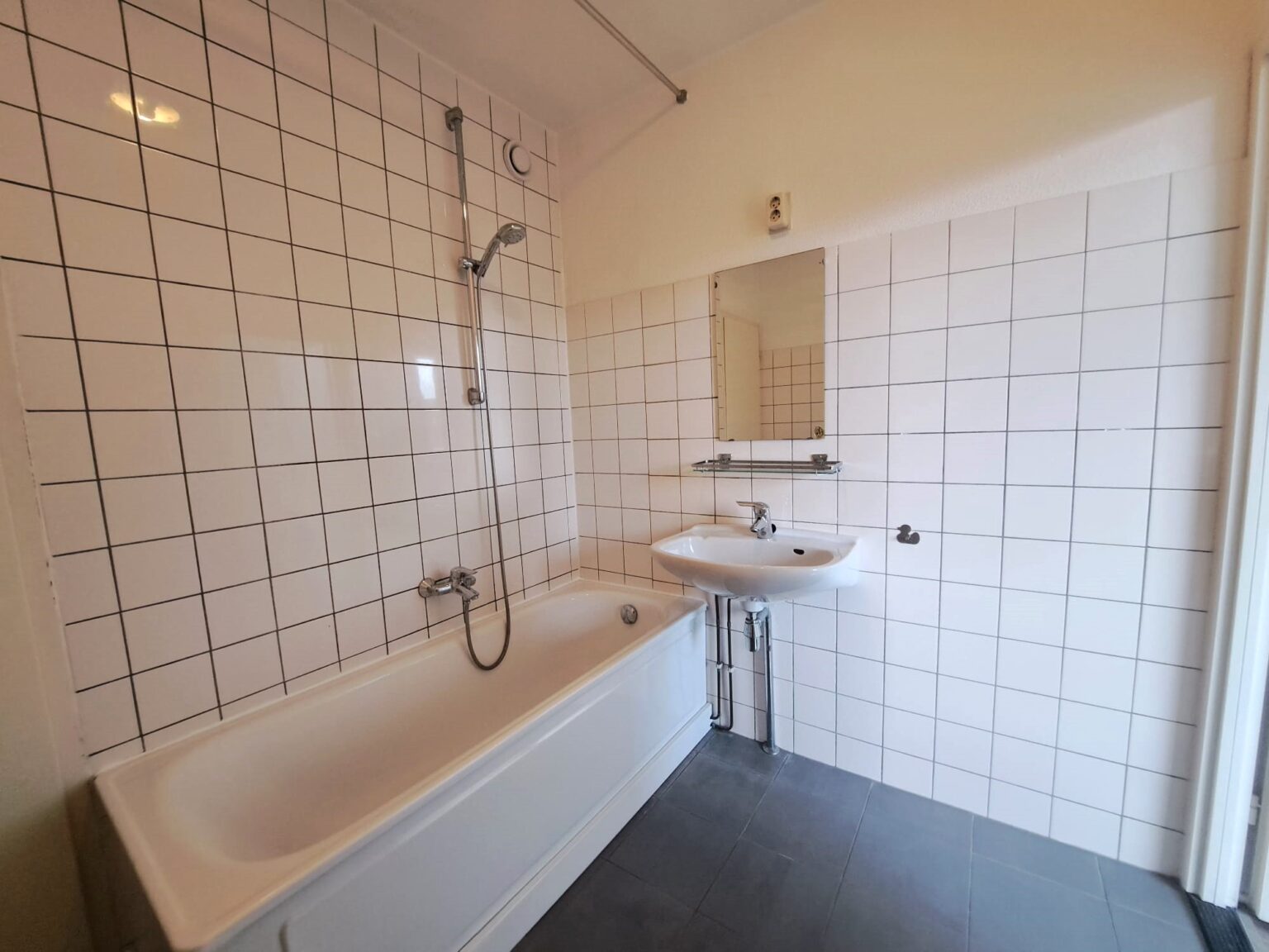 De badkamer is direct toegankelijk vanuit de slaapkamer en is praktisch ingericht, zodat je voldoende ruimte hebt. Achter de badkamer bevindt zich het toilet, dat van twee kanten bereikbaar is.