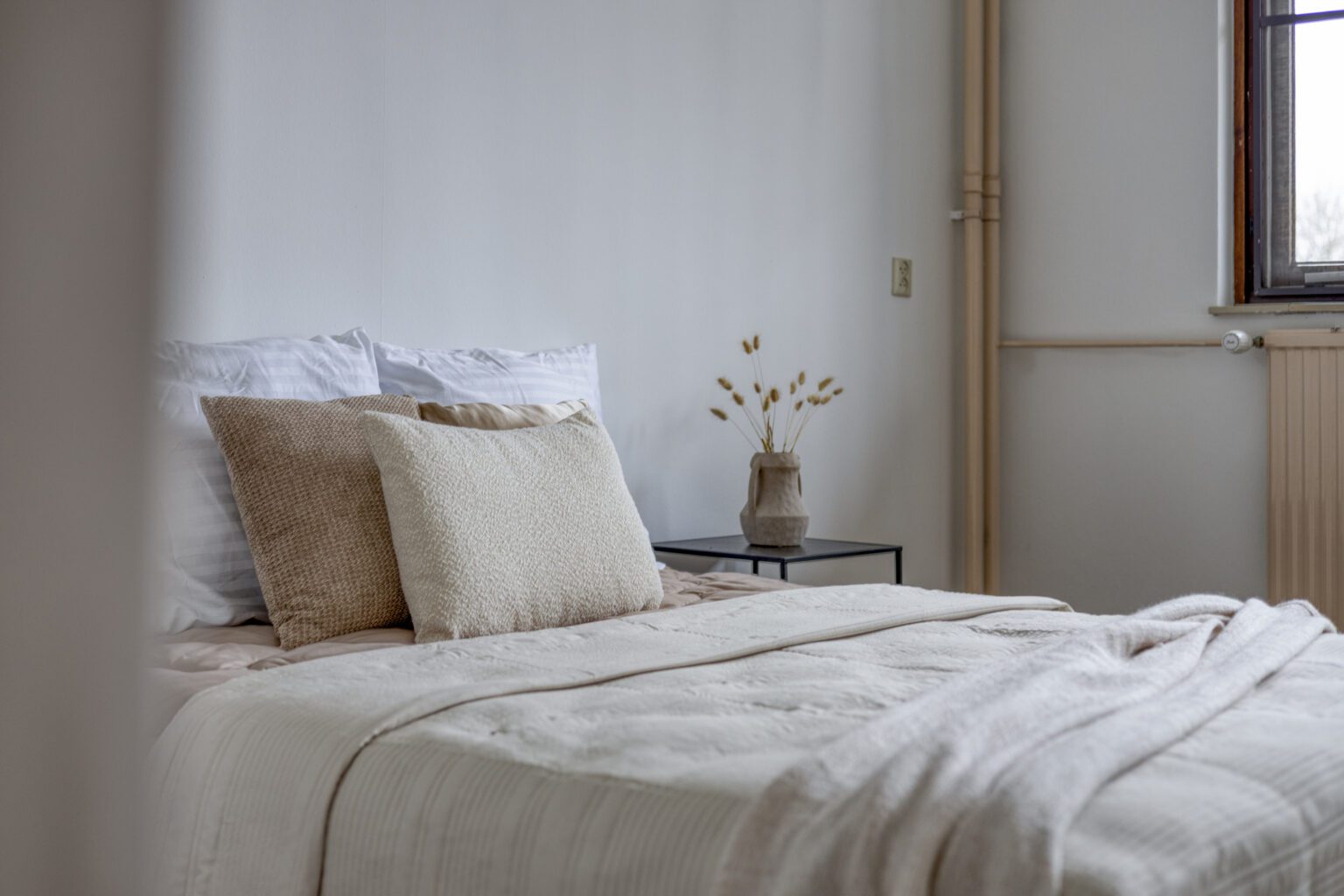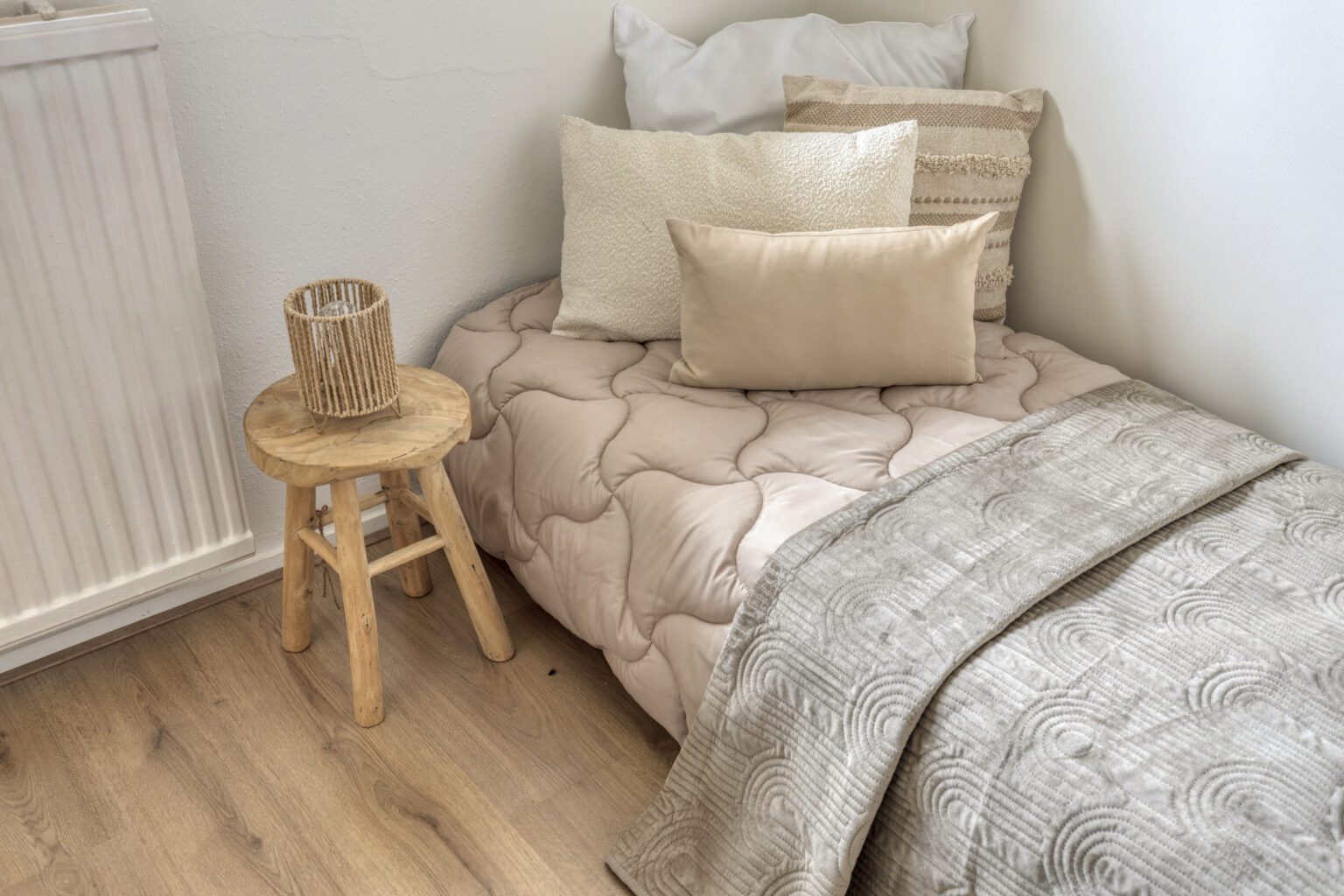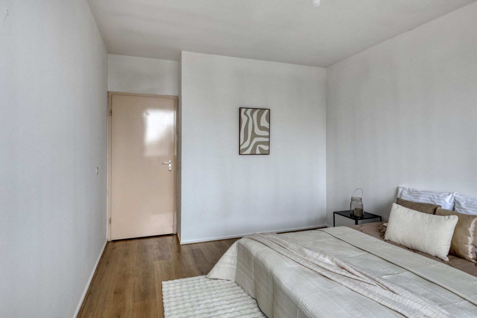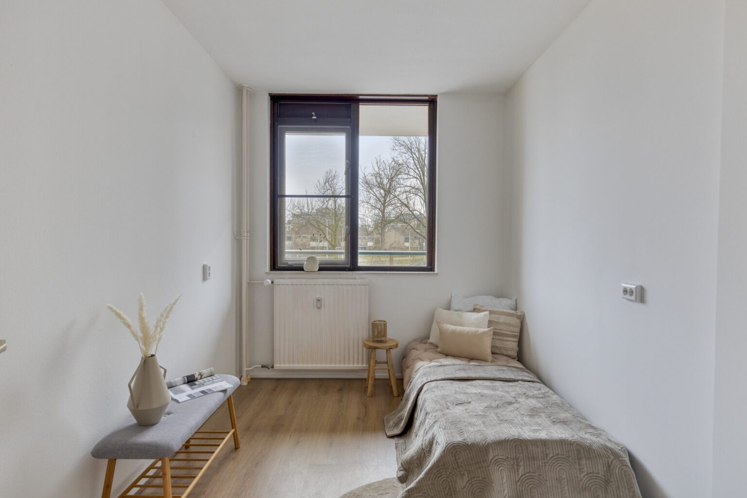 Het appartement beschikt over twee royale (slaap)kamers. De grootste kamer ligt aan de voorzijde en biedt een prettig uitzicht over de wijk. Er is voldoende ruimte voor een groot bed én een kledingkast of bureau. Het grote raam zorgt voor veel natuurlijk licht, wat de kamer een fijne en lichte uitstraling geeft.