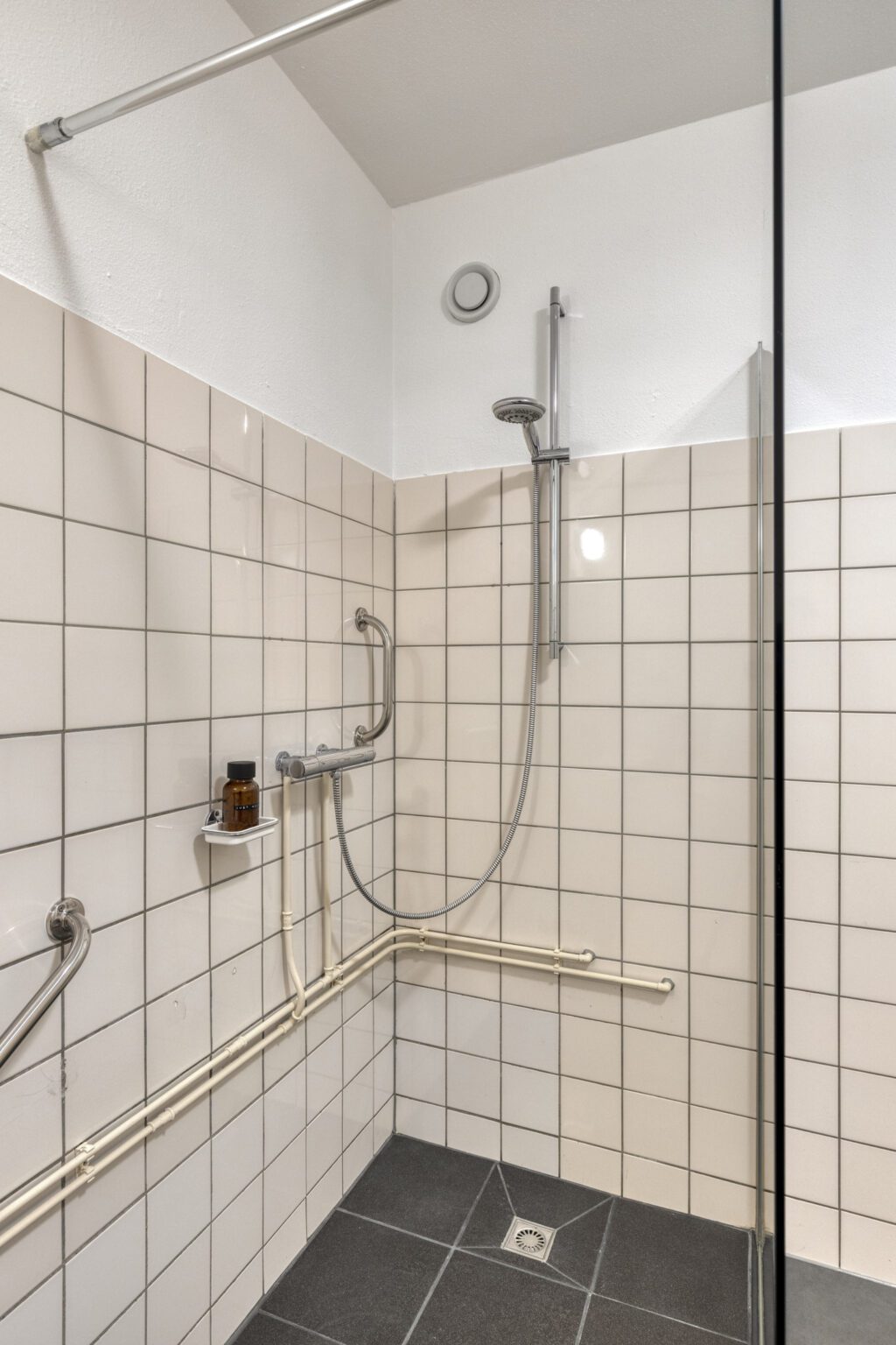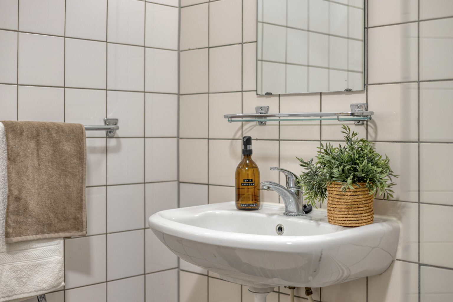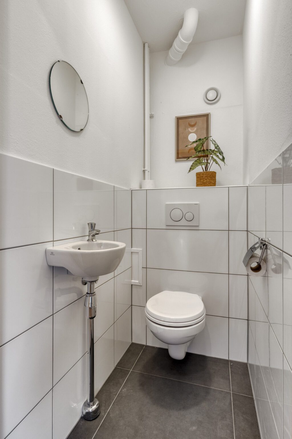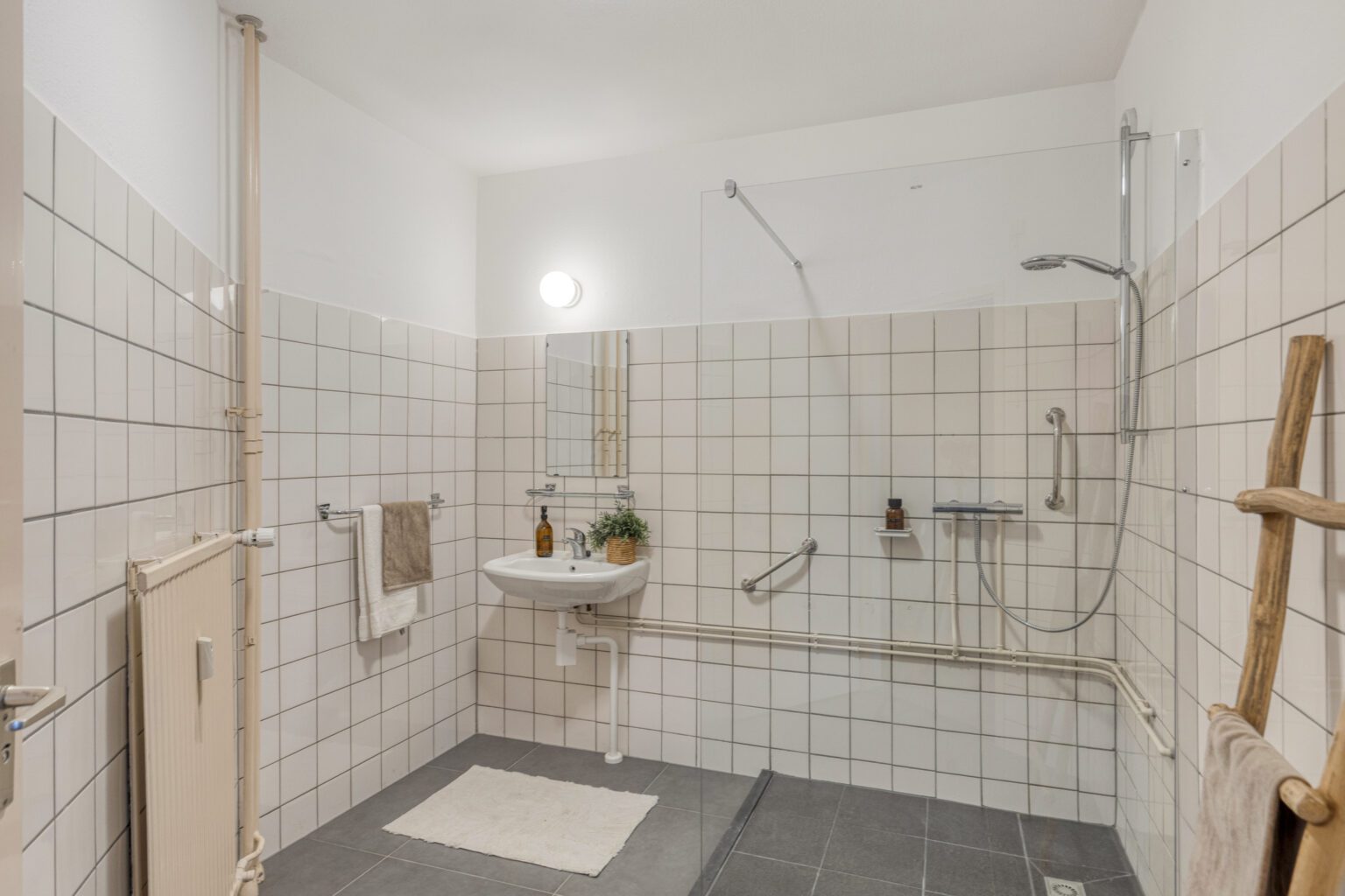 De badkamer is vanuit de hal bereikbaar en praktisch ingedeeld, waardoor er voldoende ruimte beschikbaar is. Naast de badkamer vind je de deur naar het toilet en een handige berging, die je bijvoorbeeld kunt gebruiken om er een eigen wasruimte van te maken.
