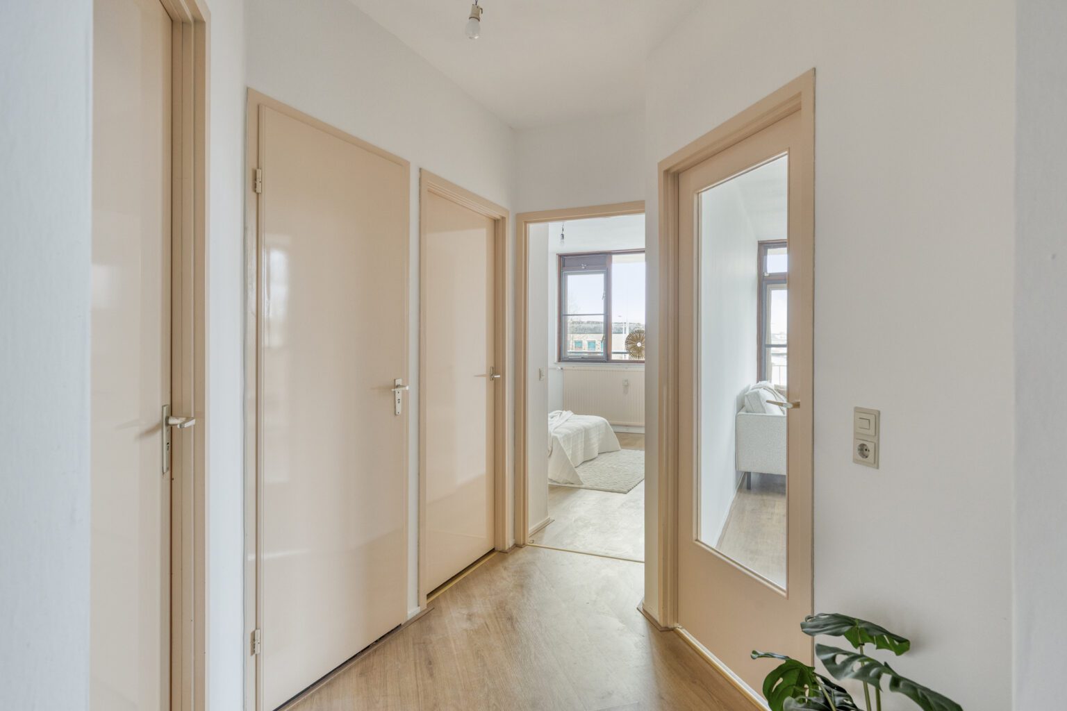 Je betreedt het appartement via de ingang “Sandenburg”, waar de brievenbussen en het bellentableau zich bevinden. Het appartement ligt op de 1e verdieping en is zowel met de trap als de lift snel bereikbaar. Met slechts drie woningen per verdieping geniet je van veel rust en privacy. Een groot voordeel van wonen op de 1e etage is dat je prettig contact hebt met de “grond”!
