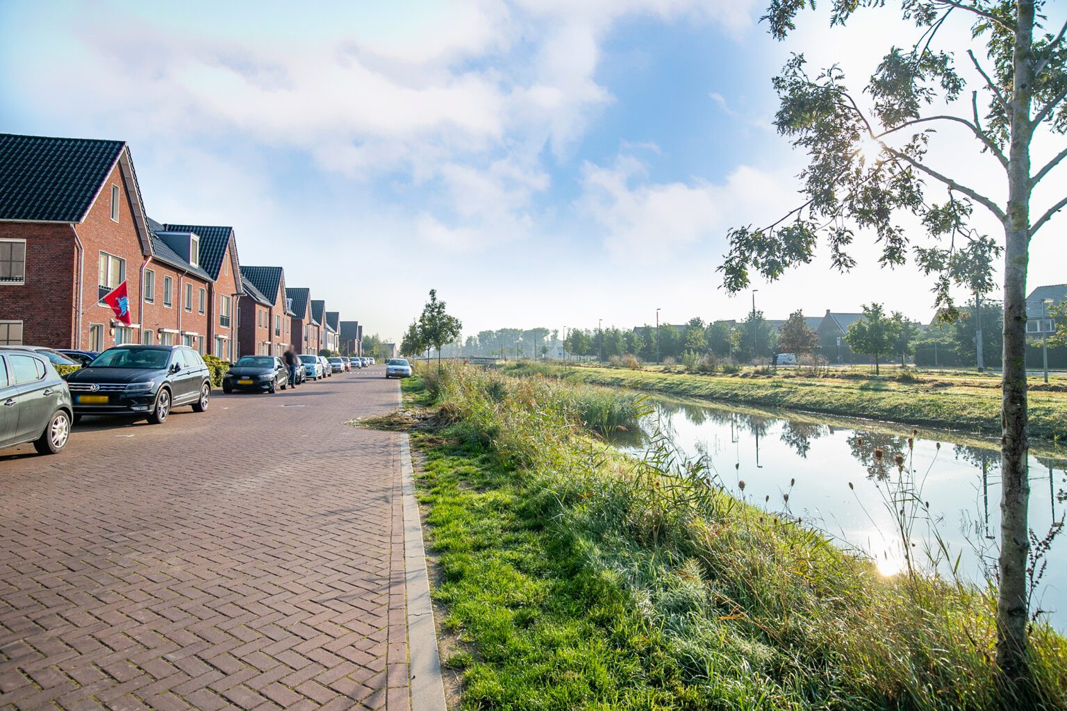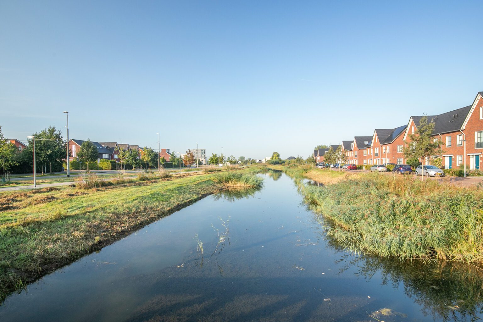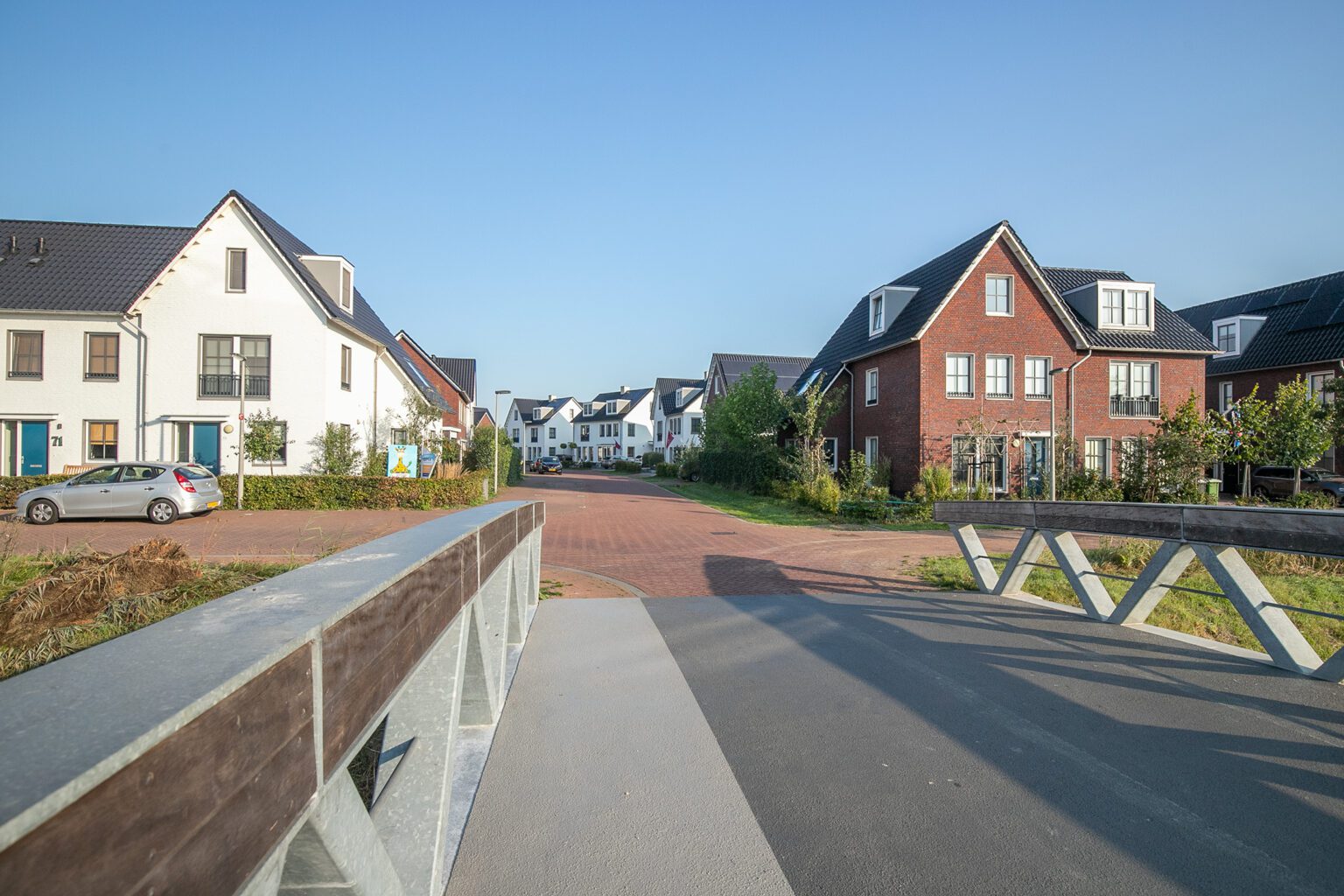 Auto’s komen Horstenhoogte binnen over een brug. Horstenhoogte is een moderne nieuwbouwwijk met veel diverse woningen gelegen in de buurt Schuytgraaf in Arnhem. De woningen zijn gelegen tussen sloten in een natuurlijke omgeving. De erfscheidingen zijn begroeid en geven de binnenhoven een groen beeld.