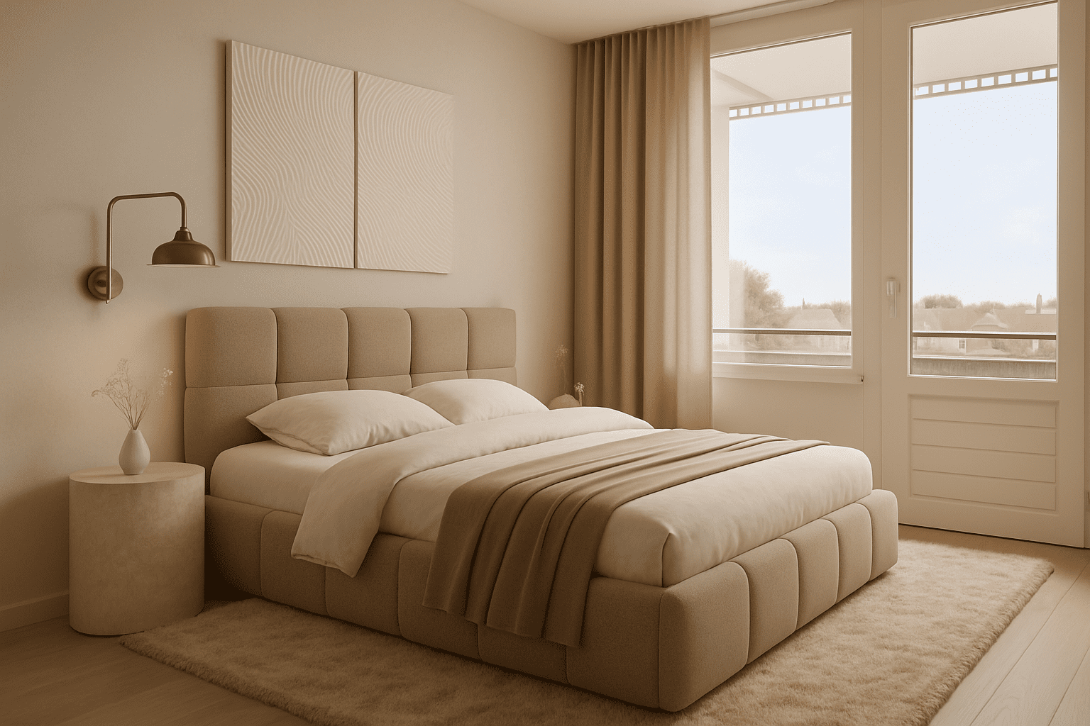 De slaapkamer is ruim opgezet en biedt volop plaats voor een comfortabel tweepersoonsbed en een grote kledingkast. Dankzij de balkondeur is de kamer heerlijk licht en goed te ventileren, en vanaf hier stap je zo het balkon op.