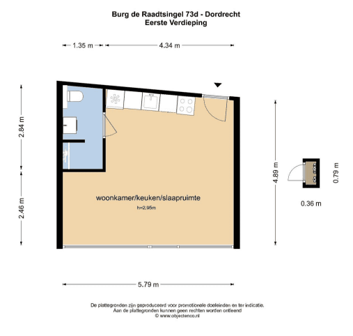 Deze studio is gelegen op de eerste etage. De open keuken is voorzien van inbouwapparatuur. Vanuit het woon-/slaapgedeelte kom je bij de badkamer welke beschikt over een wastafel, inloopdouche en wasmachine aansluiting.