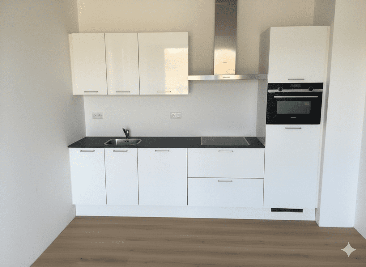 De ruime woonkamer met open keuken, voorzien van vaatwasser, spoelbak, afzuigkap, combi magnetron en koelkast, is licht en ruim door de hoge ramen. Vanuit de woonkamer loop je zo je eigen balkon op.