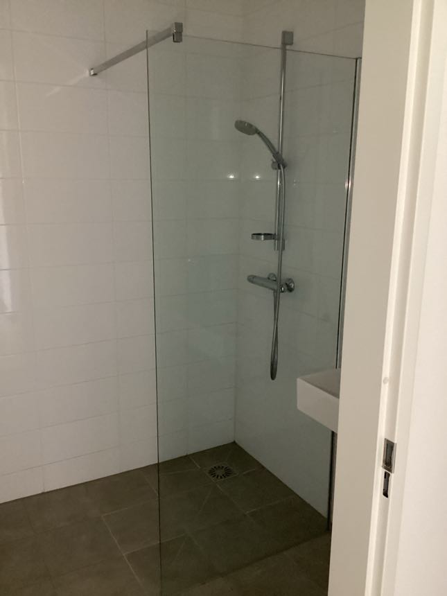 Een betegelde badkamer voorzien van een douche met glazen wanden, een wastafel en spiegel.
