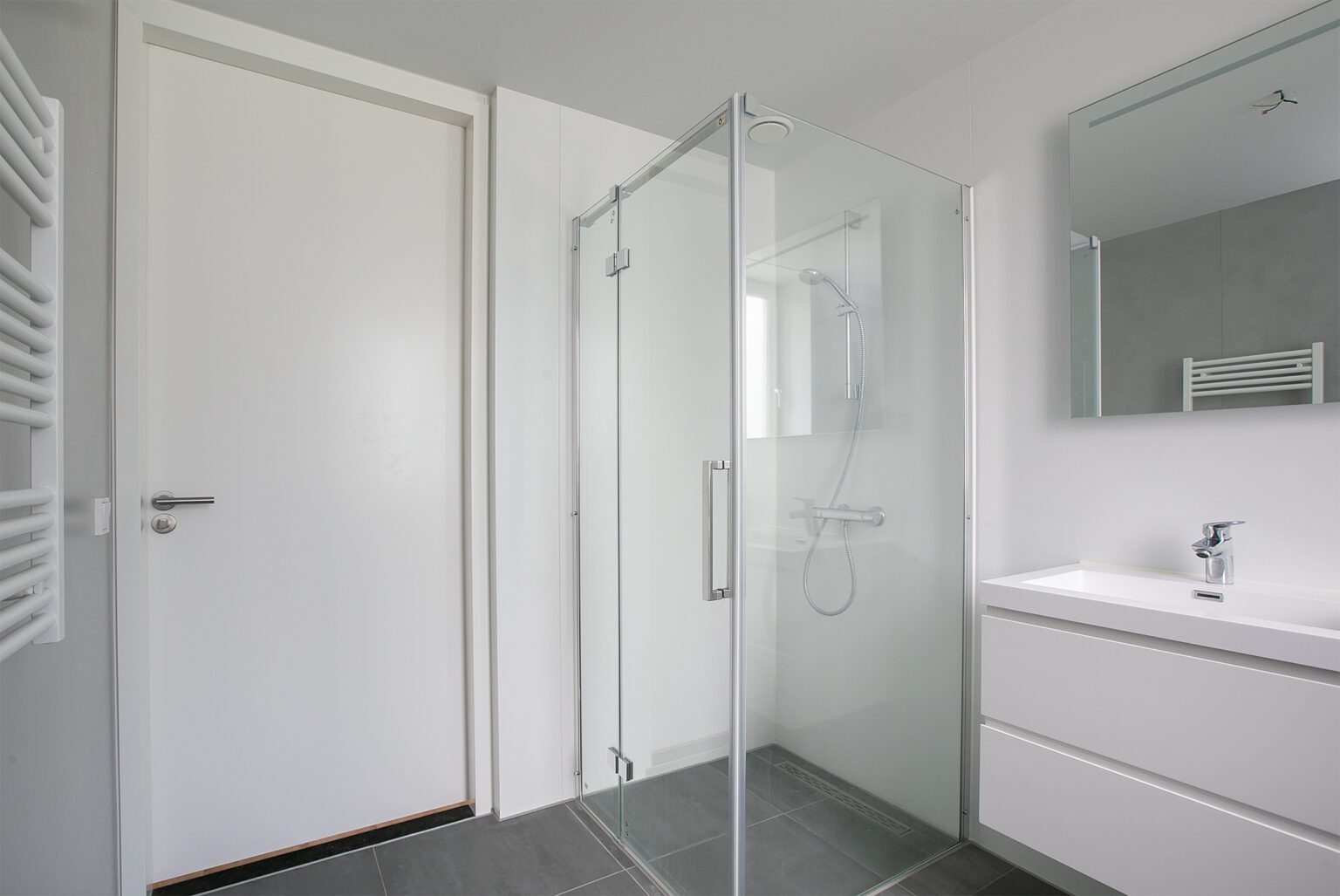 Overloop, drie volwaardige slaapkamers en een moderne badkamer met inloopdouche, wandcloset en dubbele wastafel.