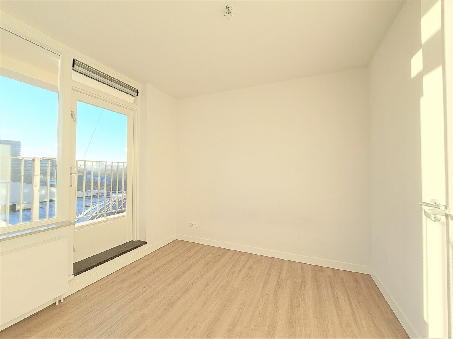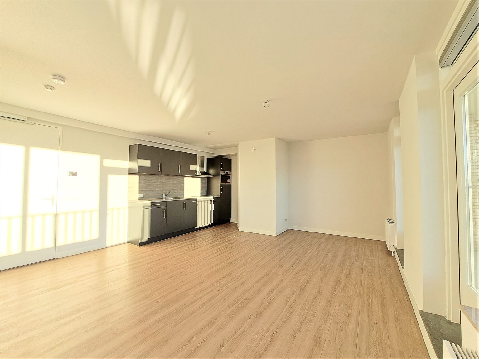 Helemaal af: De wanden zijn strak afgewerkt en er ligt een hoogwaardige pvc-vloer met houtlook door het hele appartement.