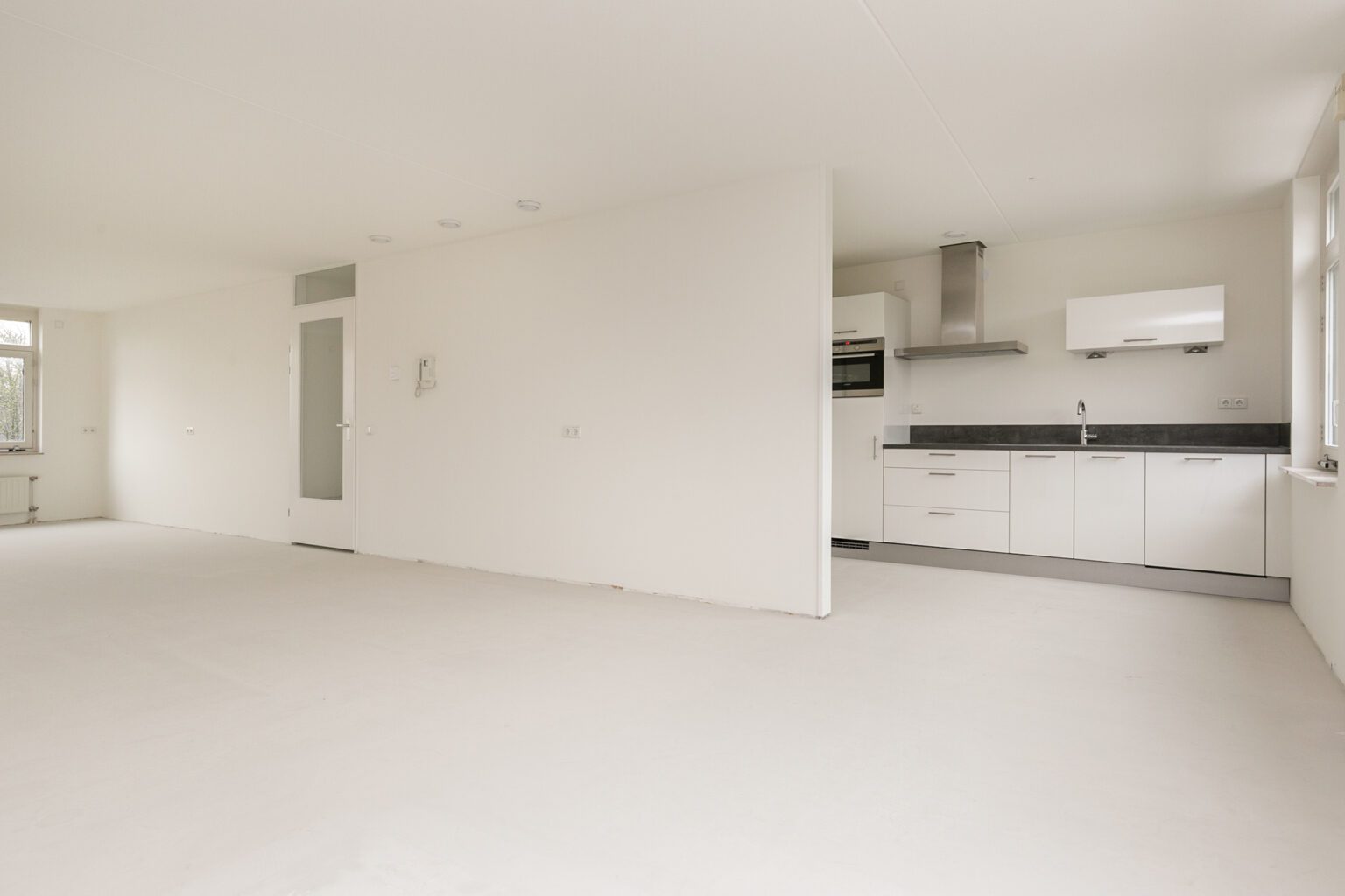 Hal met toegang tot badkamer met bad, douche, wastafel en toilet, berging, 2 slaapkamers, separaat toilet en woonkamer met open keuken welke is voorzien van diverse inbouwapparatuur, zoals een inductiekookplaat, combi-oven, vaatwasser en koelkast met vriesvakje.