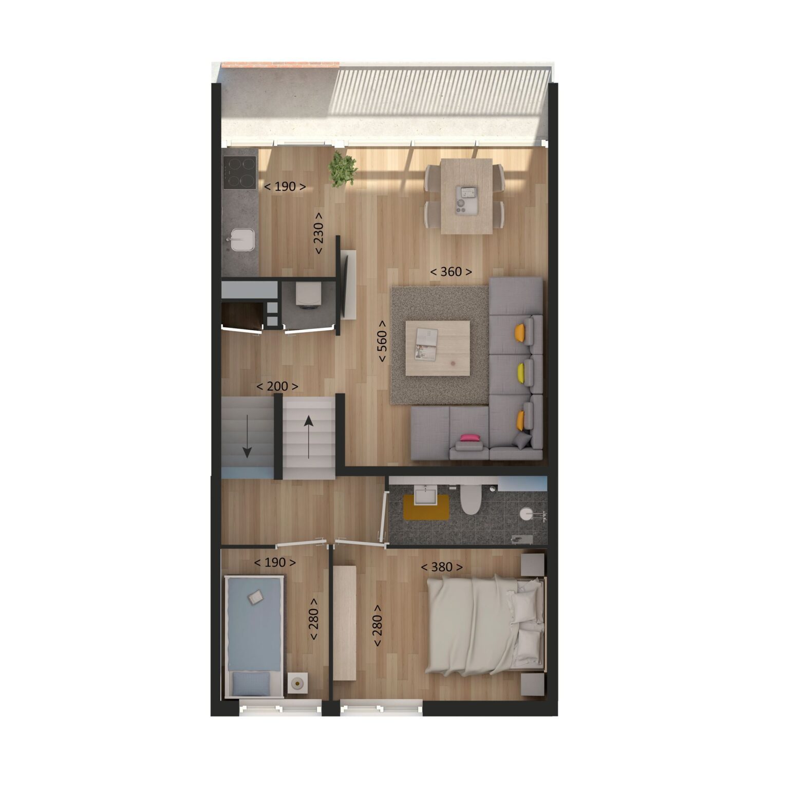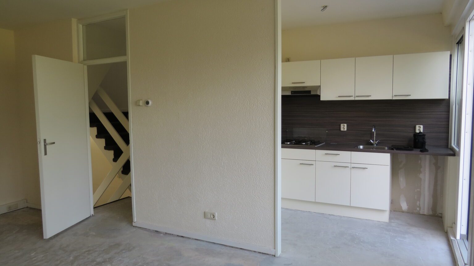 • Woonverdieping: Vanuit de hal loop je door naar de woonkamer en de open keuken. De keuken heeft een kookplaat, afzuigkap en een aansluiting voor een vaatwasser. Via de keuken stap je zo het balkon op.