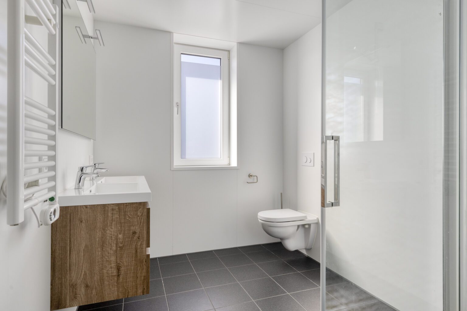 De badkamer is stijlvol afgewerkt met hoogwaardig sanitair van Villeroy & Boch. Hier beschik je over een ruime douche, een dubbele wastafel met meubel en een tweede toilet. Dankzij het raam valt er prettig daglicht binnen en is natuurlijke ventilatie mogelijk.