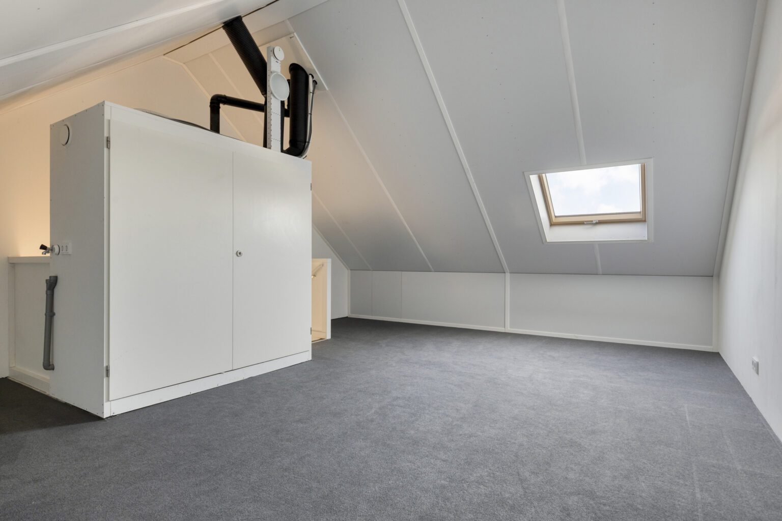 De zolderverdieping is bereikbaar via een vaste trap en biedt volop mogelijkheden. Deze ruimte leent zich perfect voor het realiseren van een extra slaapkamer, een rustige thuiswerkplek, fitnessruimte of hobbykamer. Ook bevinden zich hier de aansluitingen voor de wasmachine en droger. Een Velux dakraam zorgt voor aangenaam daglicht en ventilatie. De technische installaties, waaronder de warmtepomp, omvormer voor de zonnepanelen en de WTW-unit, zijn netjes weggewerkt in een centrale kastruimte.
