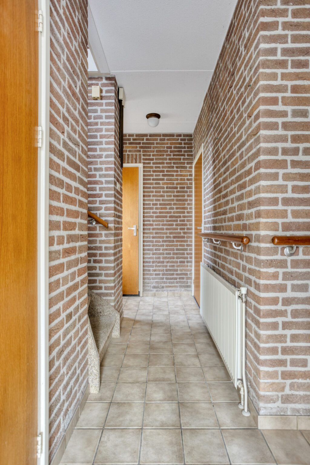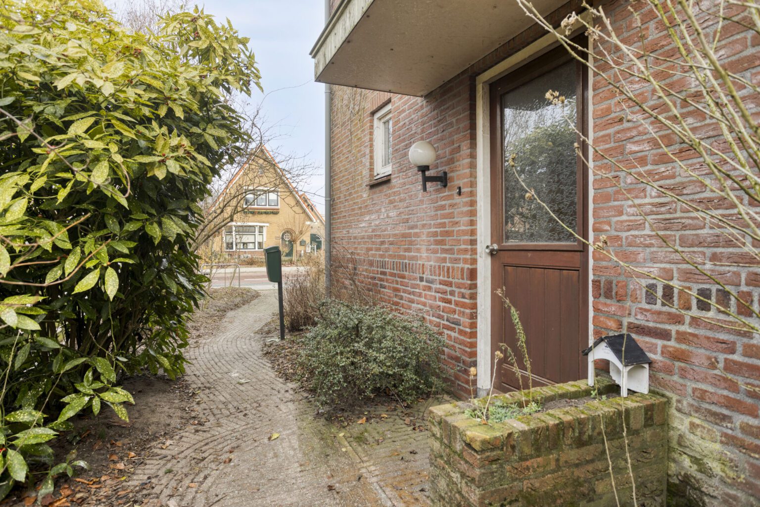 De voordeur is aan de zijkant van de woning gesitueerd; via deze entree kom je in de hal, die toegang biedt tot de badkamer, woonkamer, keuken en trap naar de eerste verdieping.