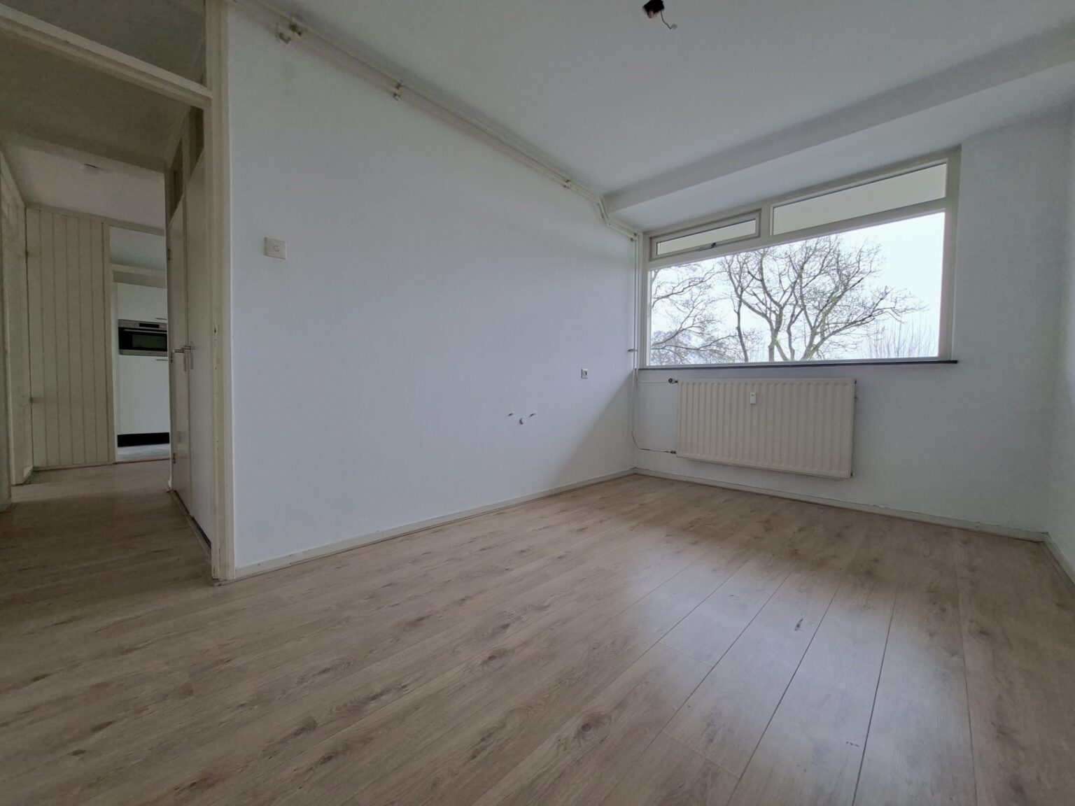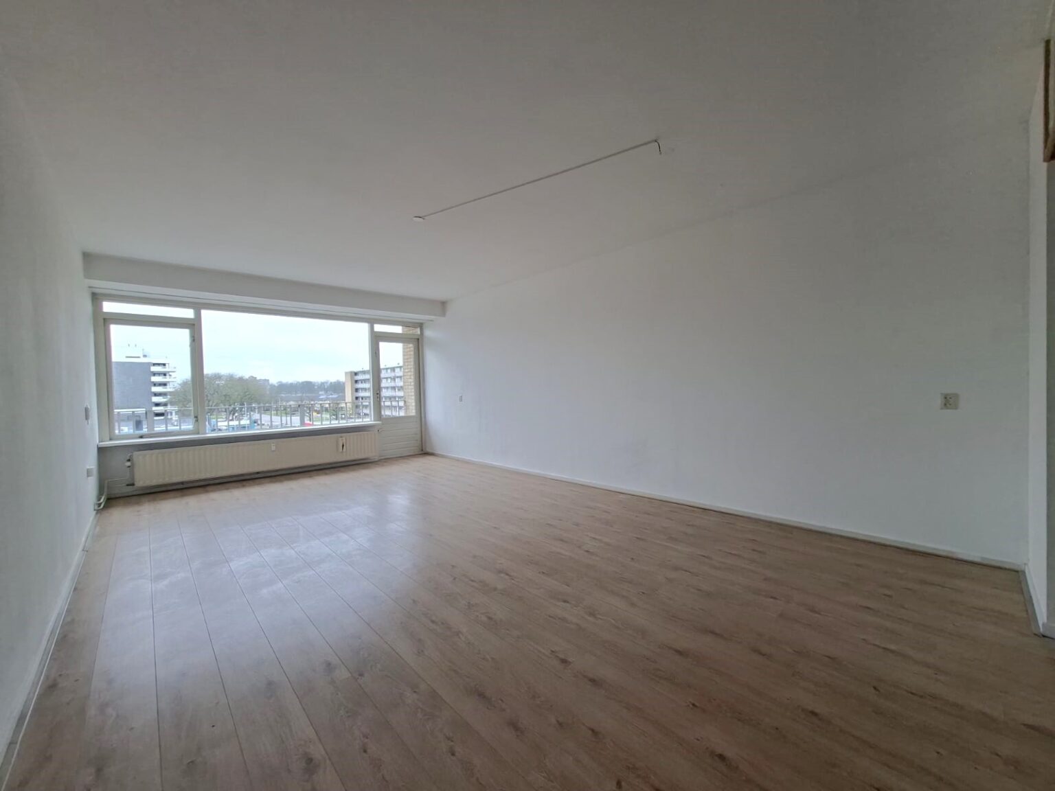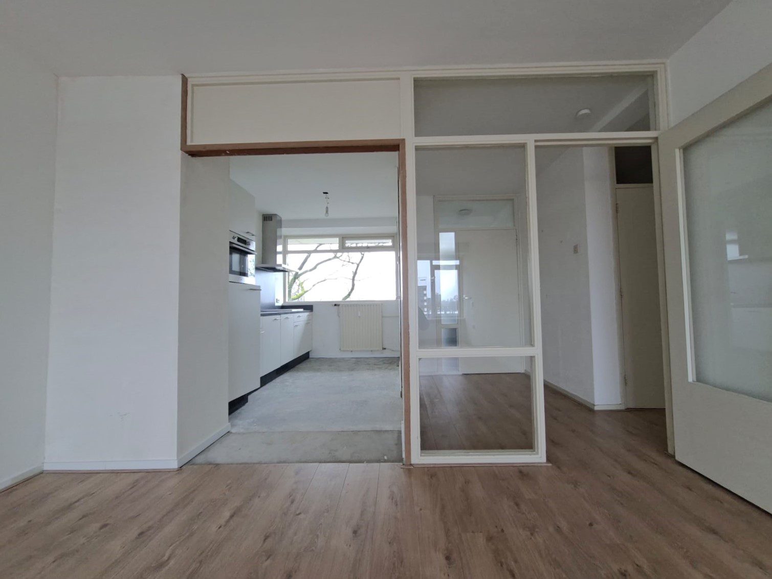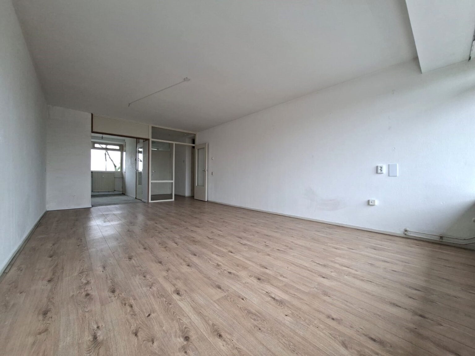 De ruime woonkamer met een grote glaspartij zit vol natuurlijk licht, wat de sfeer lekker luchtig en gezellig maakt. Of je nu een grote loungebank wilt neerzetten of een knus hoekje voor thuiswerken wilt creëren, de mogelijkheden zijn eindeloos. In de zomer kun je heerlijk buiten zitten op het balkon.