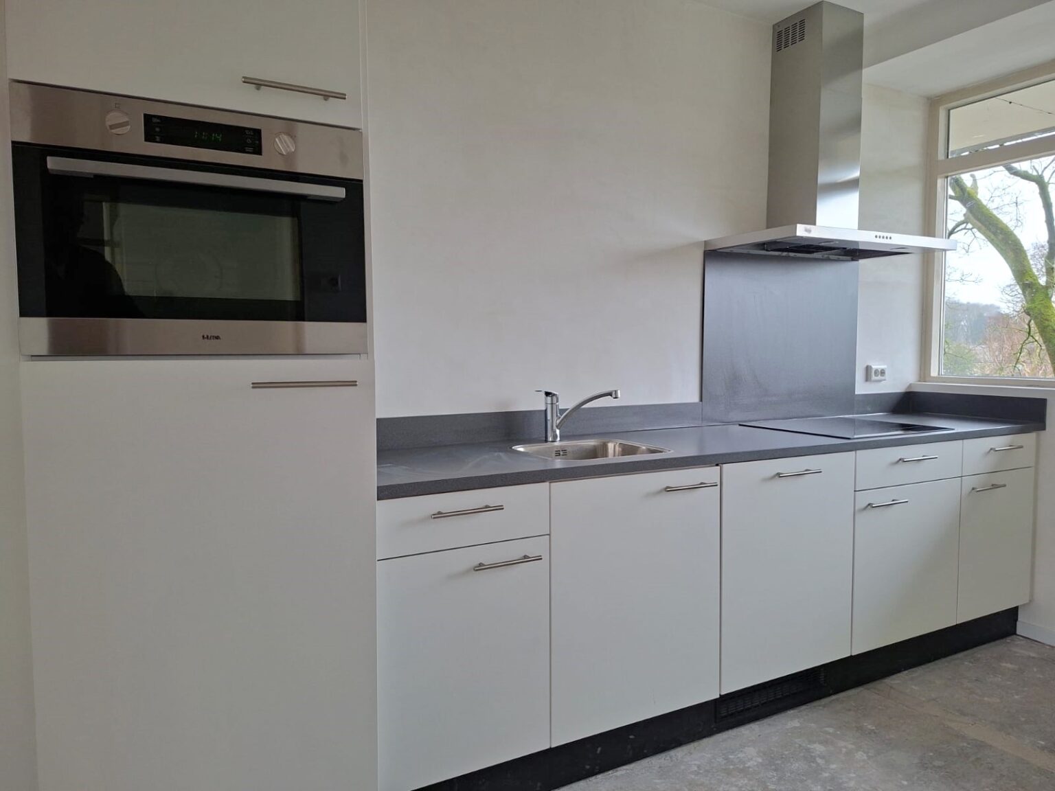 De moderne keuken grenst aan de woonkamer en bevindt zich aan de voorzijde van de woning. Deze is prima vanuit de hal bereikbaar, zodat je je tassen met boodschappen eenvoudig neer kan zetten.