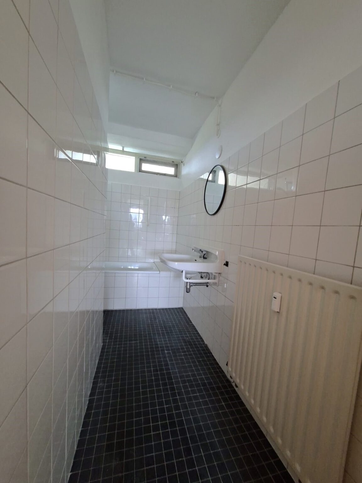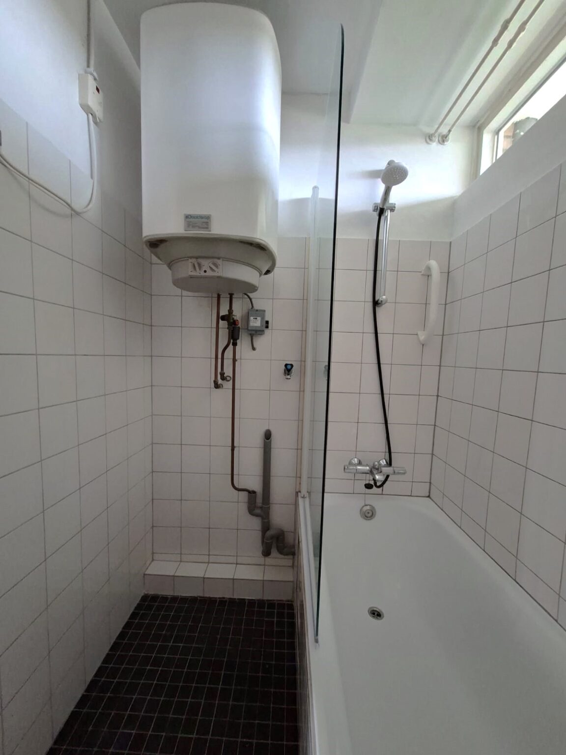 De badkamer is een fijne plek om te ontspannen, met een ligbad, wastafel en ruimte voor je wasmachine. Het raampje boven de douche kan je openzetten voor de ventilatie en er valt daglicht naar binnen. Naast de badkamer bevindt zich een apart toilet met een fonteintje.