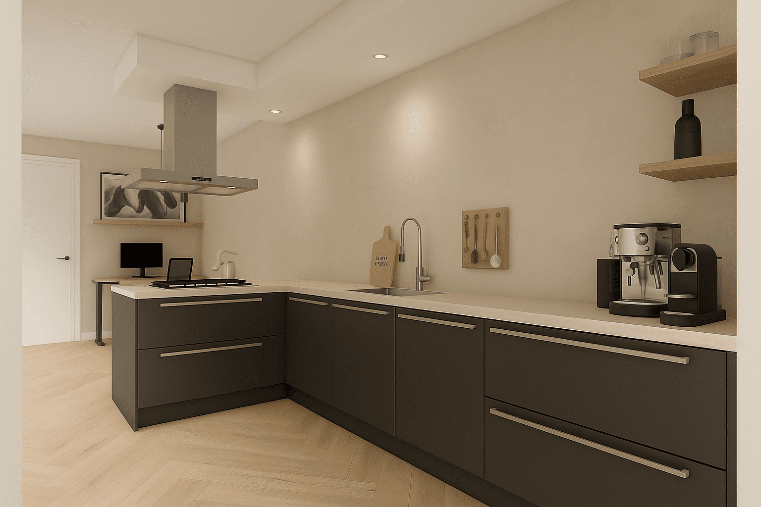 In het midden ligt de open keuken, ideaal voor iedereen die van koken en samenzijn houdt. Er is voldoende werkbladruimte en genoeg opslag voor al je kookgerei. Door het open karakter van de keuken blijf je altijd in contact met de rest van de ruimte, waardoor koken een stuk gezelliger wordt.