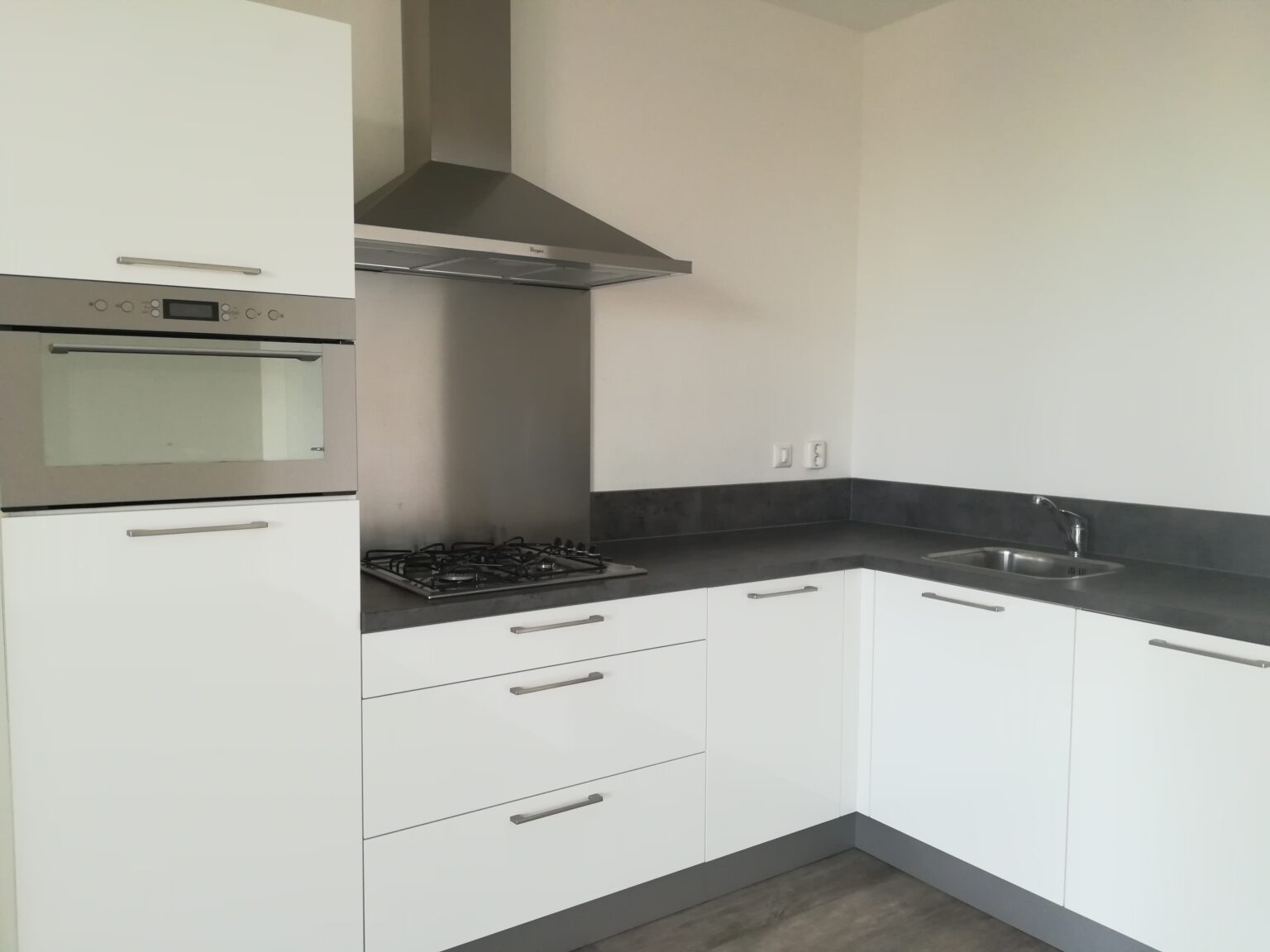 De keuken is modern in witte kleurstelling met antraciet blad, volledig voorzien van Whirlpool-inbouwapparatuur: koel/vriescombinatie, vaatwasser, combimagnetron, gaskookplaat en afzuigkap.