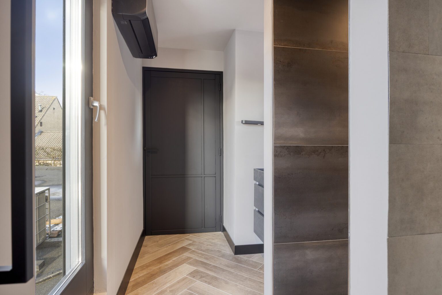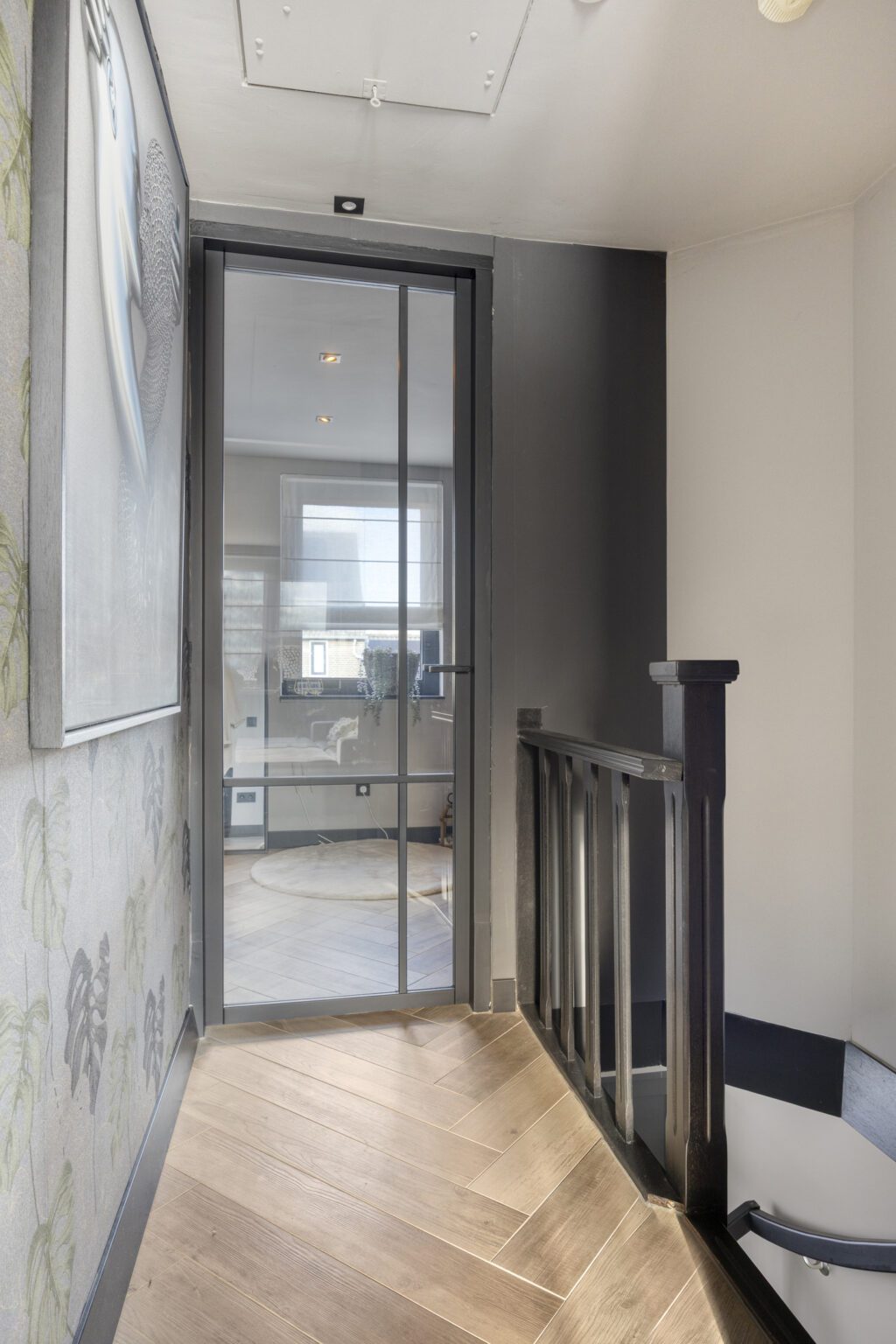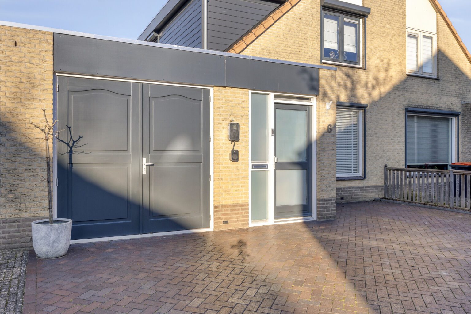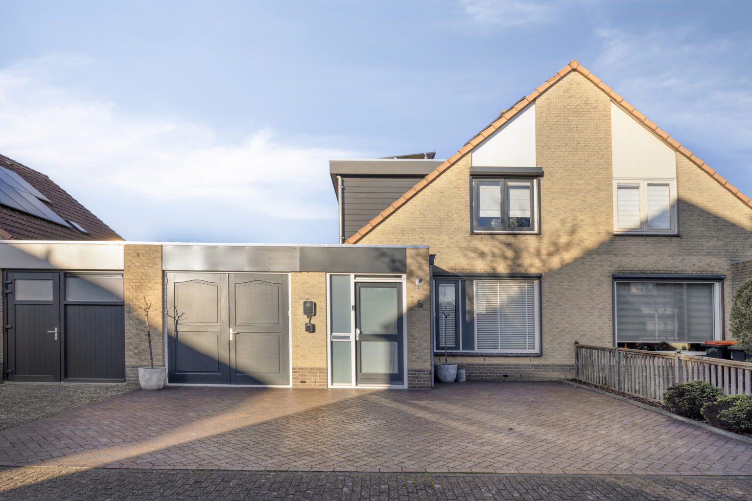 Eenmaal bij de woning, is er voor de deur eenvoudig ruimte voor twee auto’s, inclusief een elektrische laadvoorziening, waardoor zowel parkeren als opladen van een elektrische auto probleemloos is. Via de voordeur stap je direct de woning binnen, die een warme en uitnodigende entree biedt.