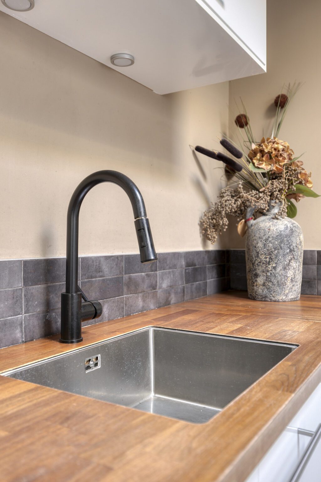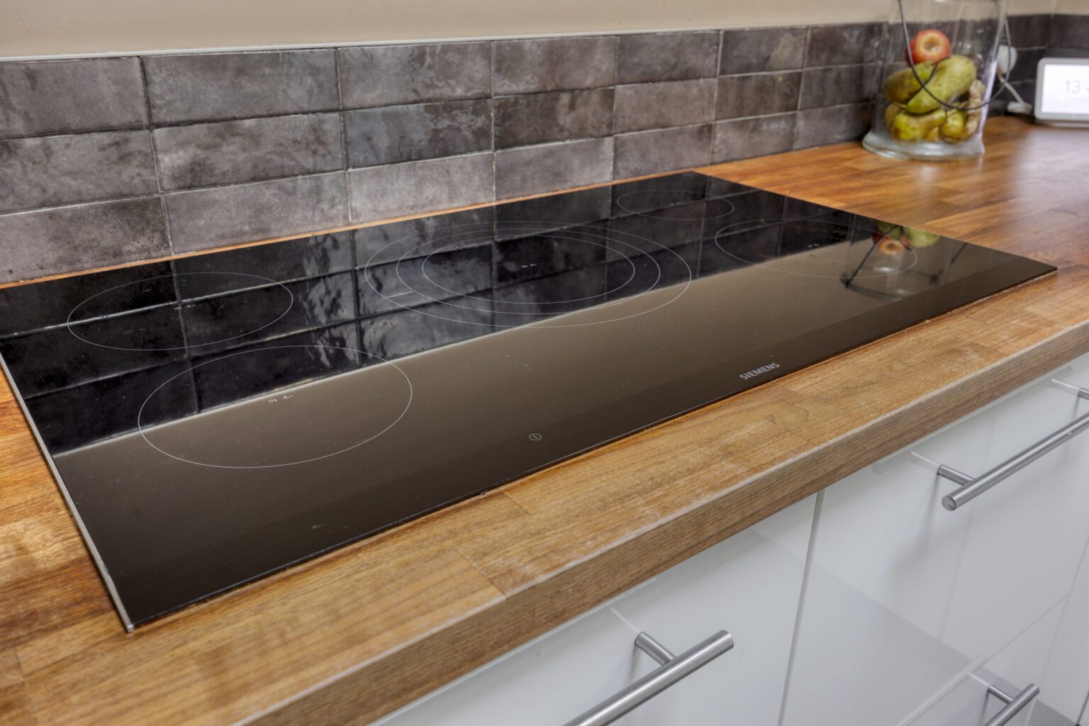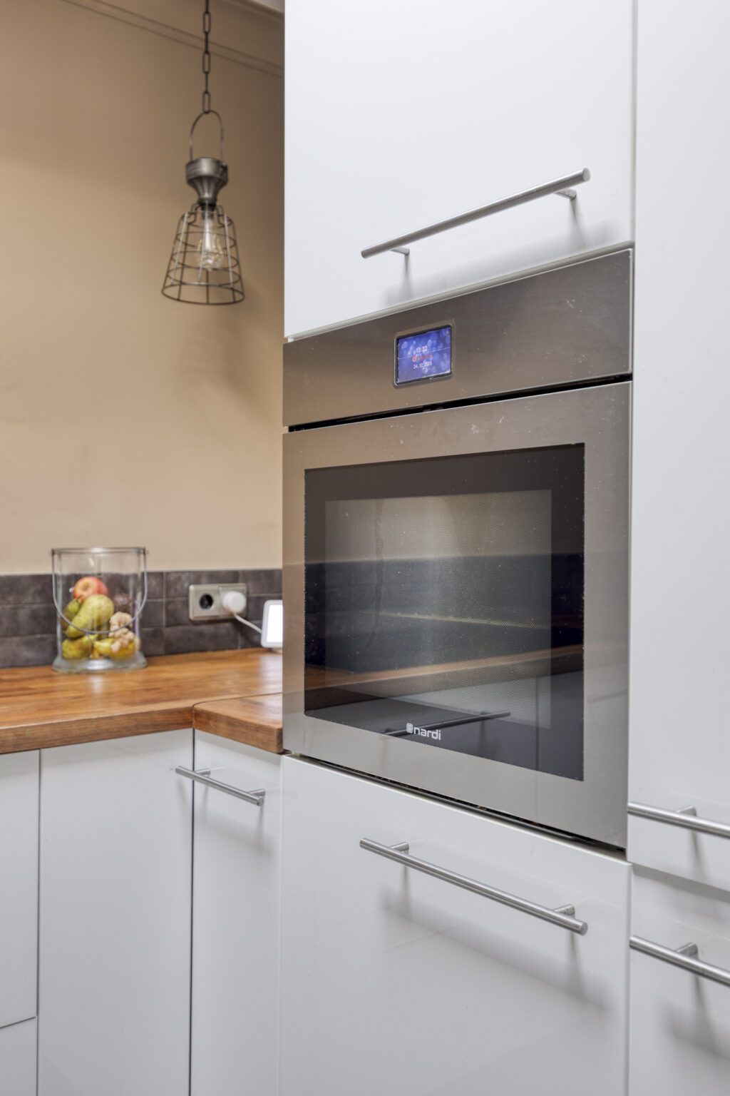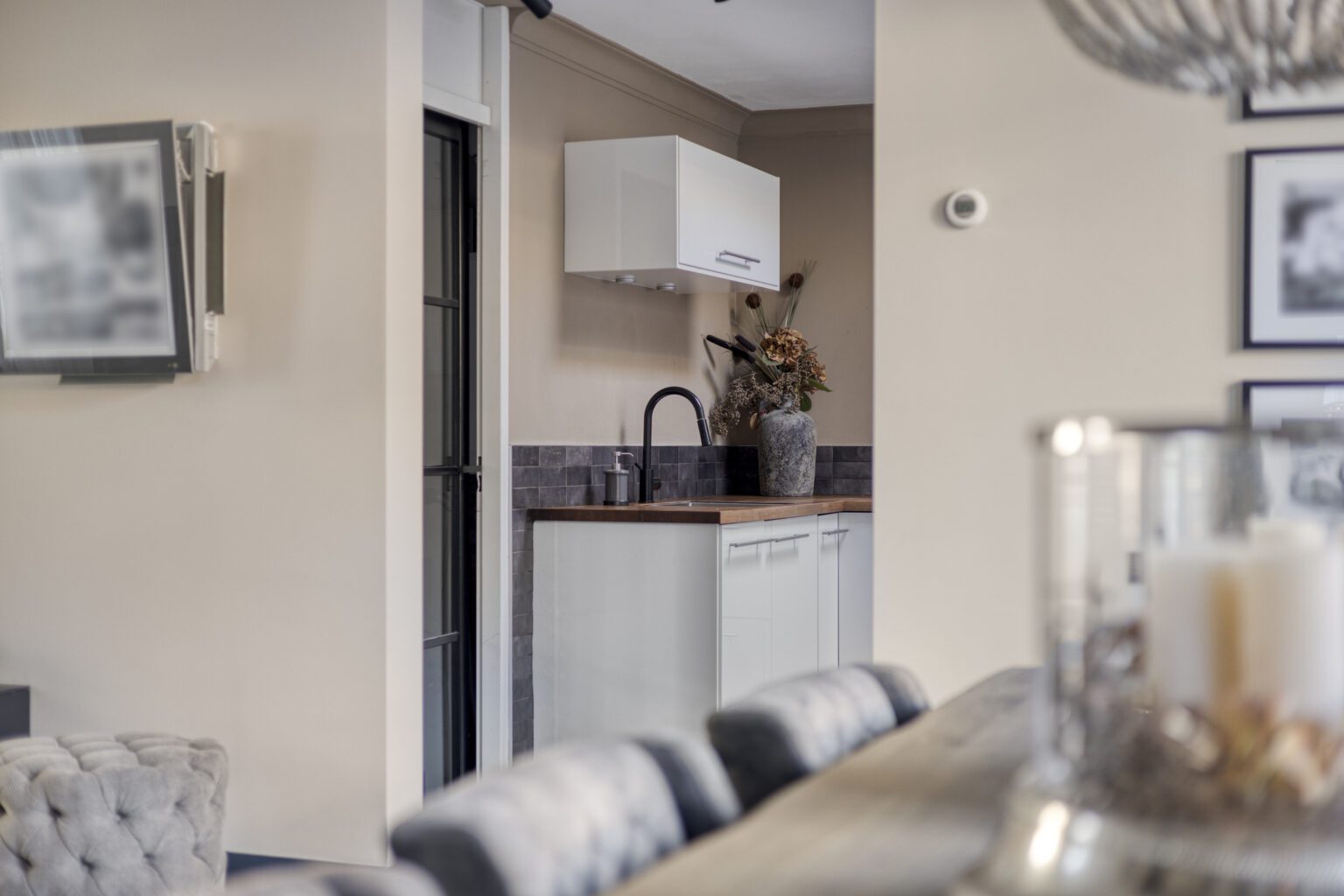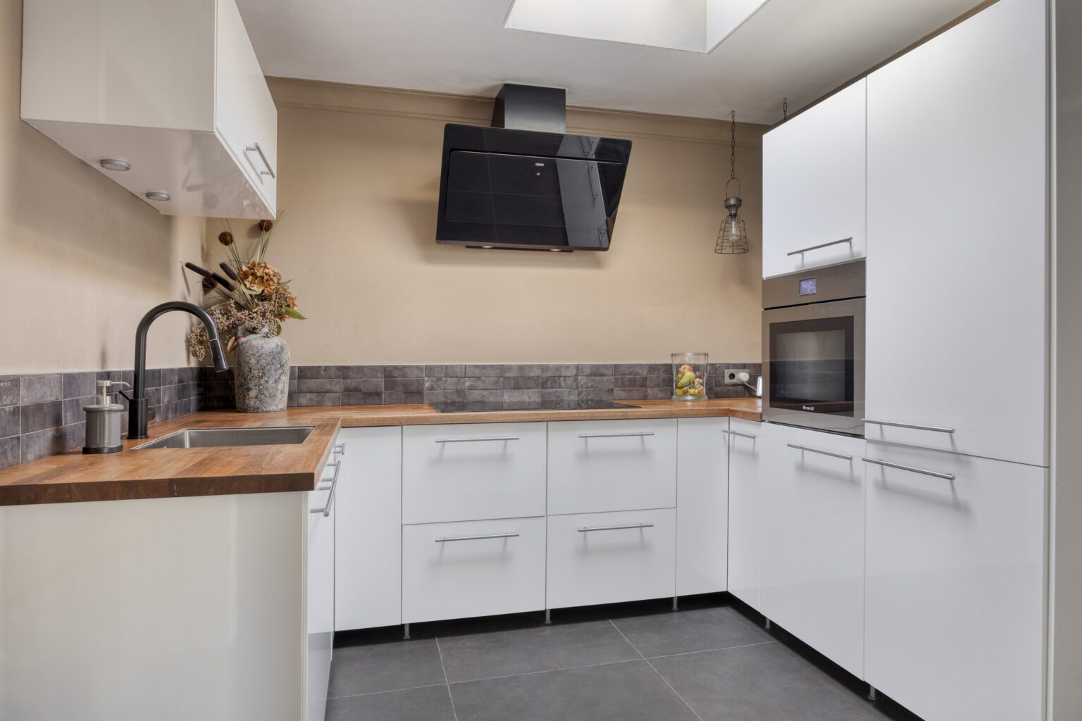 De U-vormige keuken is netjes weggeplaatst, maar behoudt toch een open en uitnodigende uitstraling. Voorzien van een inductiekookplaat met afzuigkap en oven, heb je hier werkelijk alles binnen handbereik. Daarnaast is er volop werkruimte aanwezig.