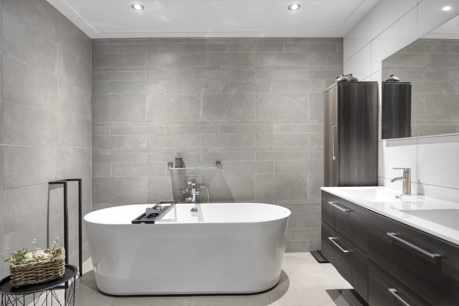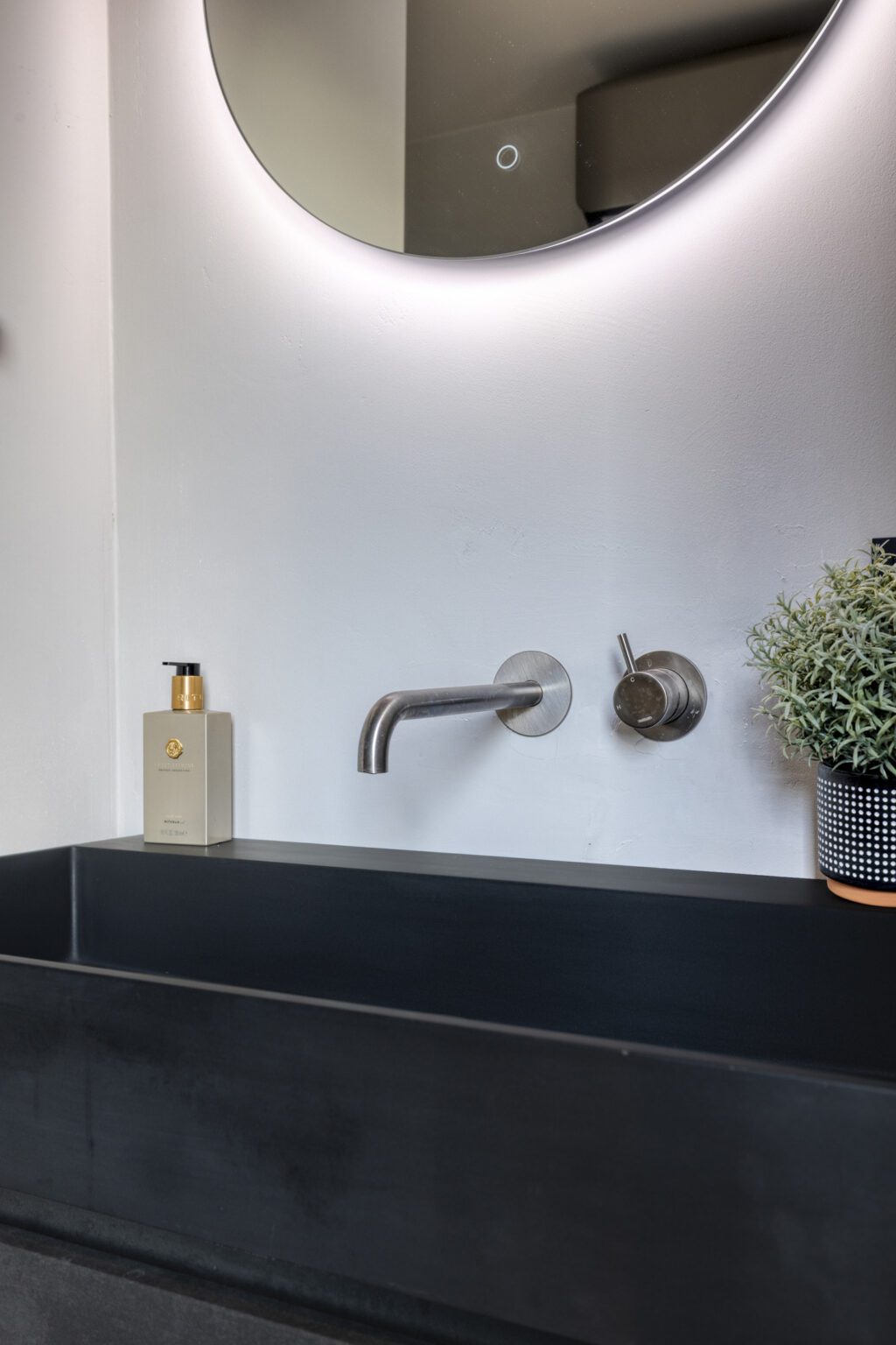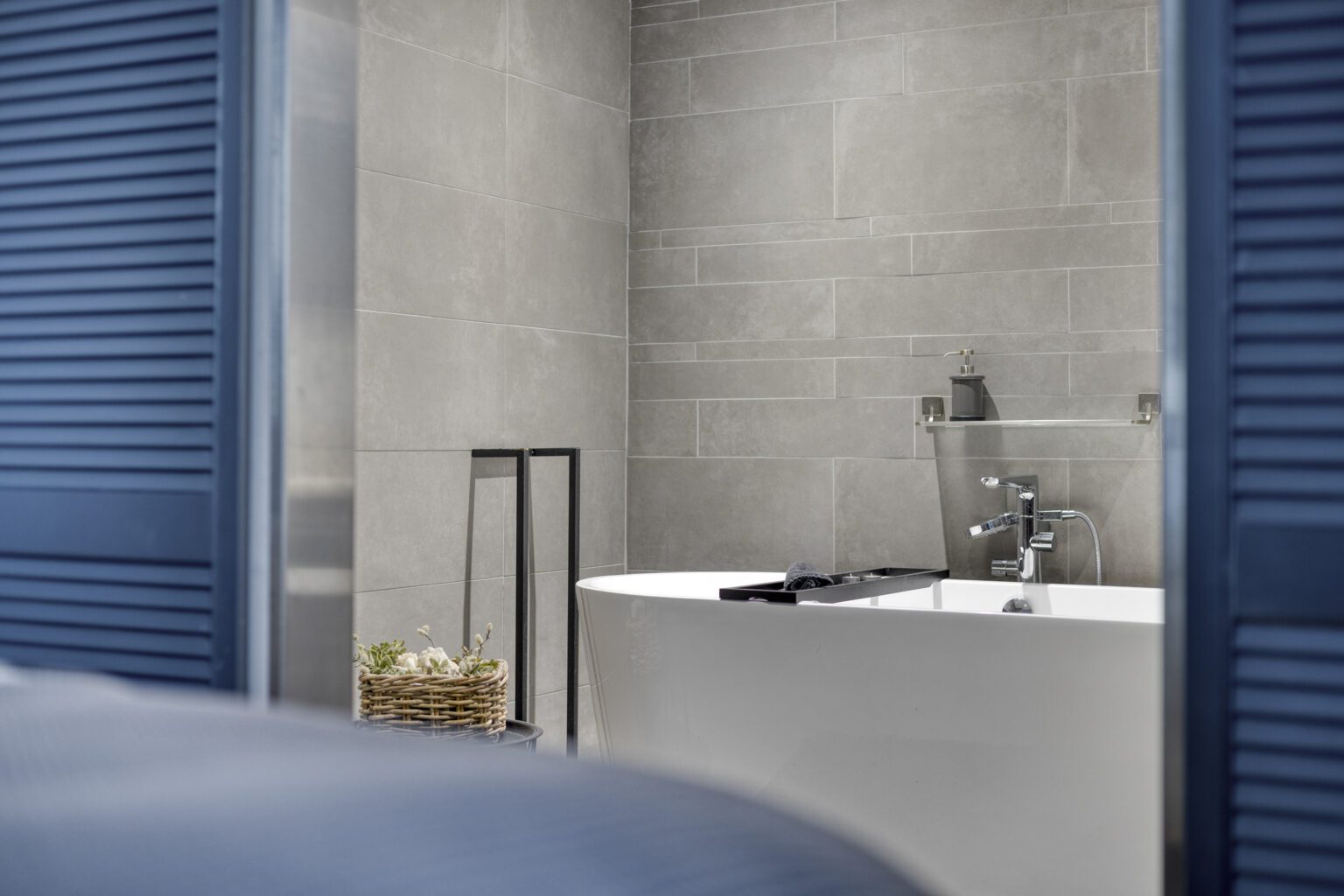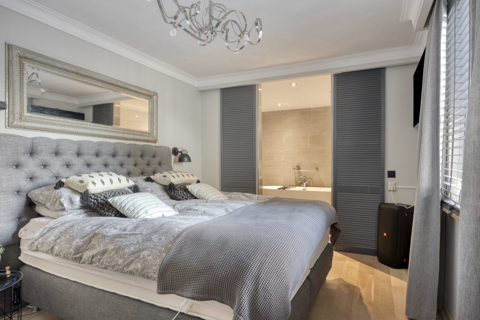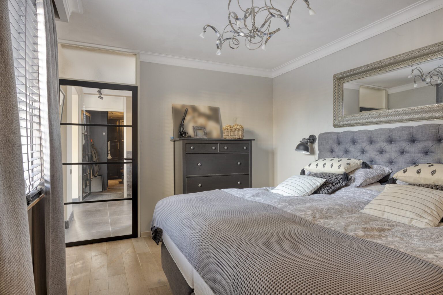 Vanuit de keuken loop je direct door naar de slaapkamer, die voldoende ruimte biedt voor een groot tweepersoonsbed. De kamer grenst aan een eigen badkamer, voorzien van twee fraaie sierdeuren. De badkamer is uitgerust met een ligbad, een stijlvol badmeubel en een wandcloset. Deze opzet maakt de begane grond ideaal voor gelijkvloers wonen of voor gasten die extra privacy wensen.