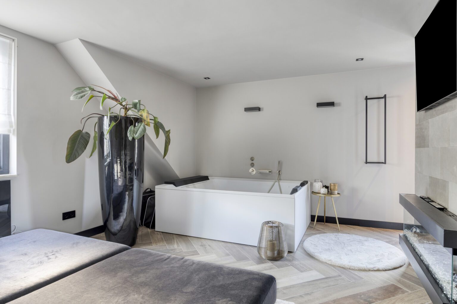 De grote kamer is voorzien van luxe en comfort. Zo is er onder andere een heerlijk whirlpool, een mooie open haard en een airco. Dankzij de grote dakkapel is er extra ruimte en veel natuurlijk licht. Om de hoek heb je een doorgang naar een separaat wandcloset en de badkamer. De badkamer beschikt over een stijlvol badmeubel en een ruime inloopdouche.