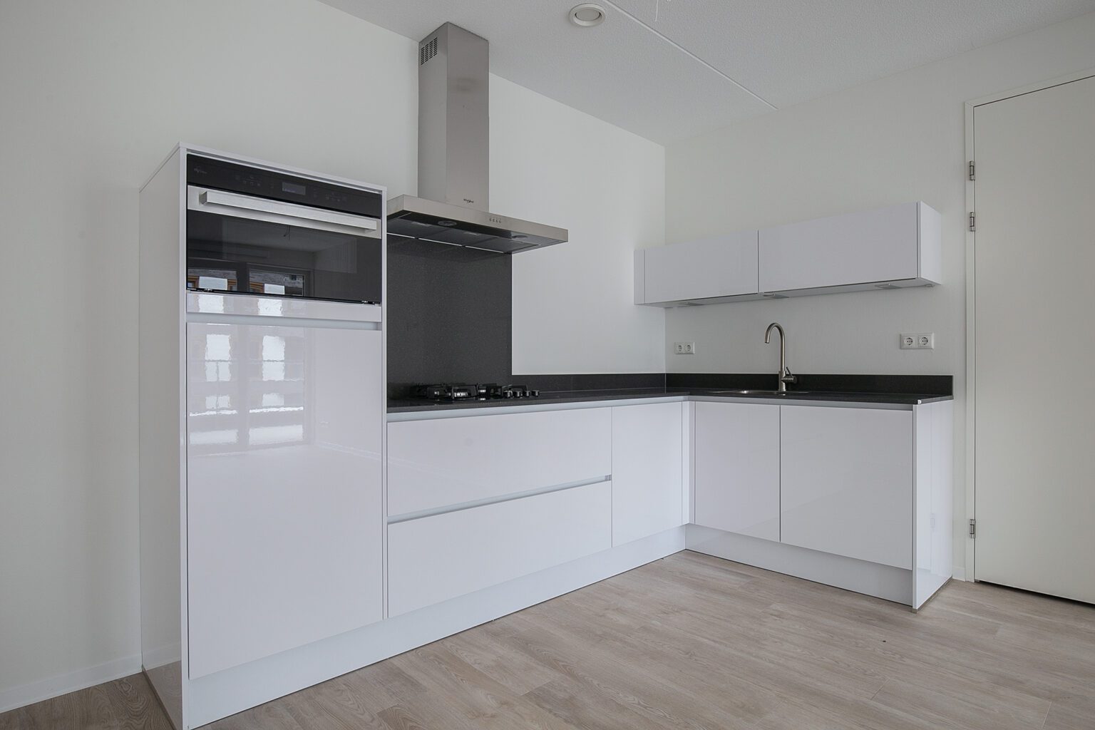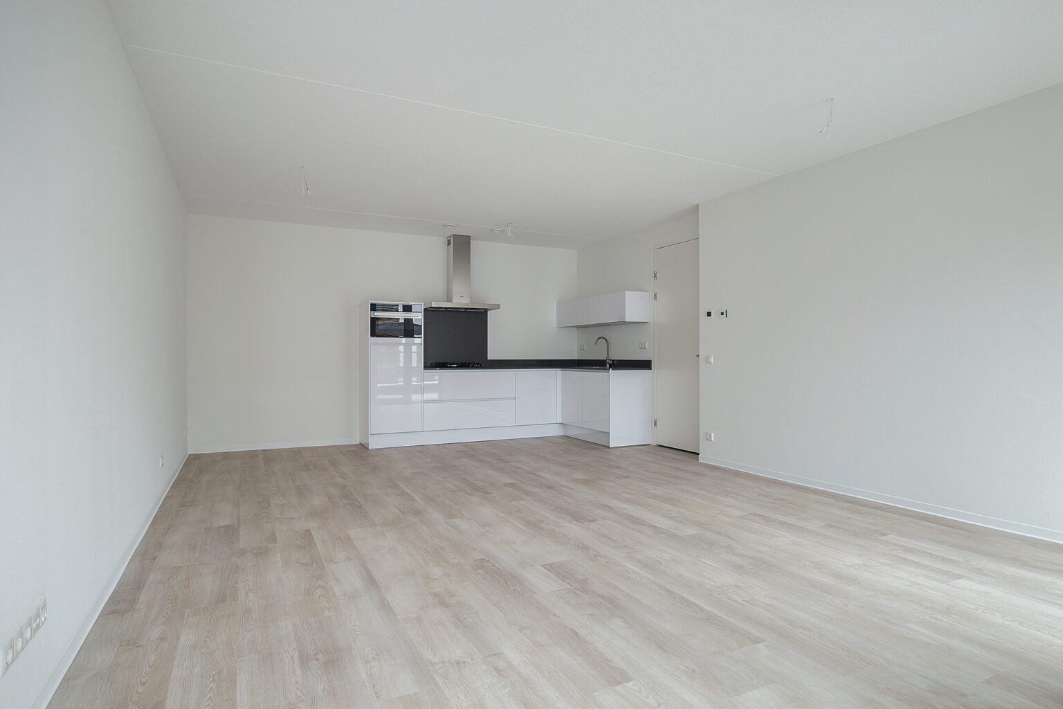 De woning van 80 m2 is voorzien van een fijne woonkamer met open keuken. De open keuken is voorzien van inbouwapparatuur, zoals kookplaat, afzuigkap, koelkast met vriezer. Vanuit de woonkamer heb je toegang tot het balkon.