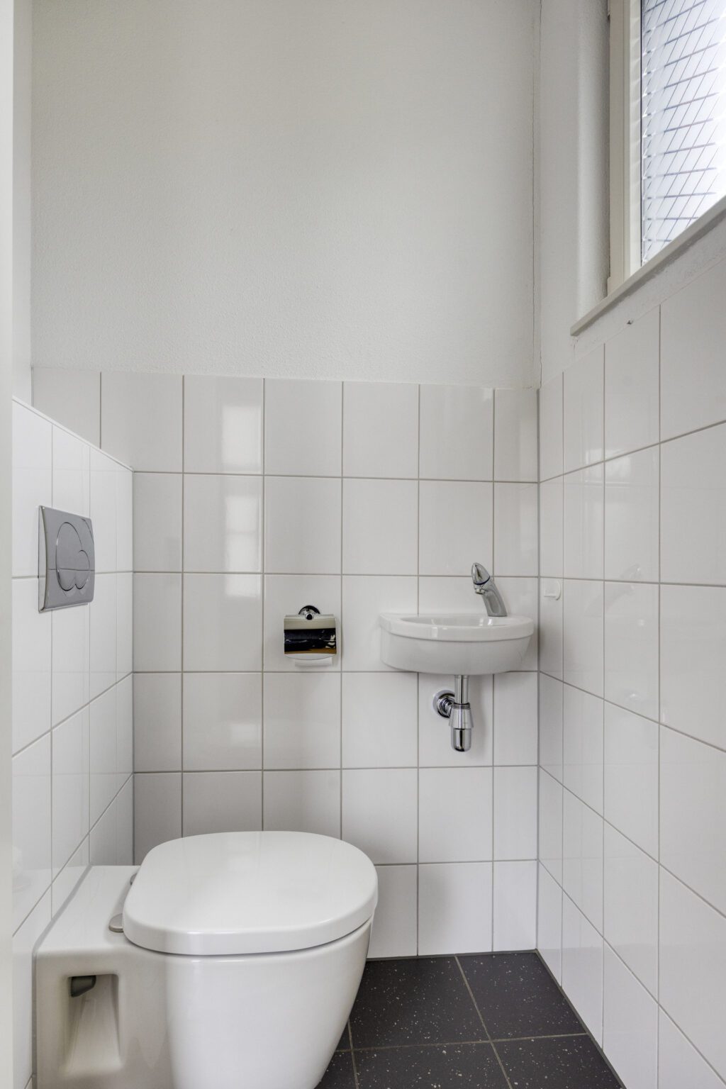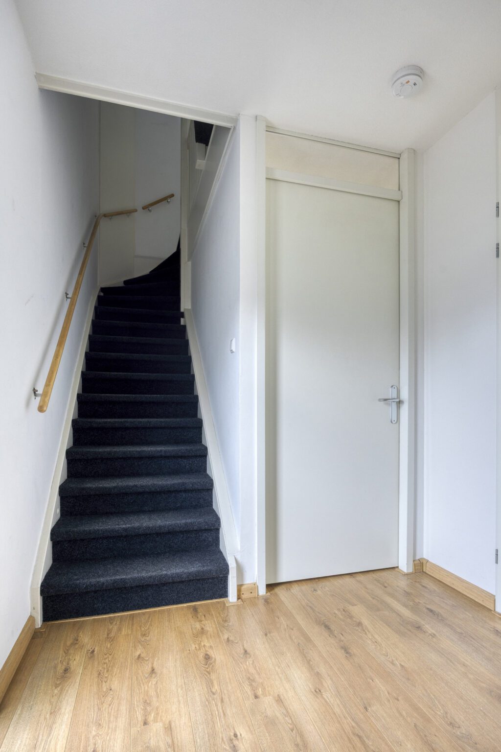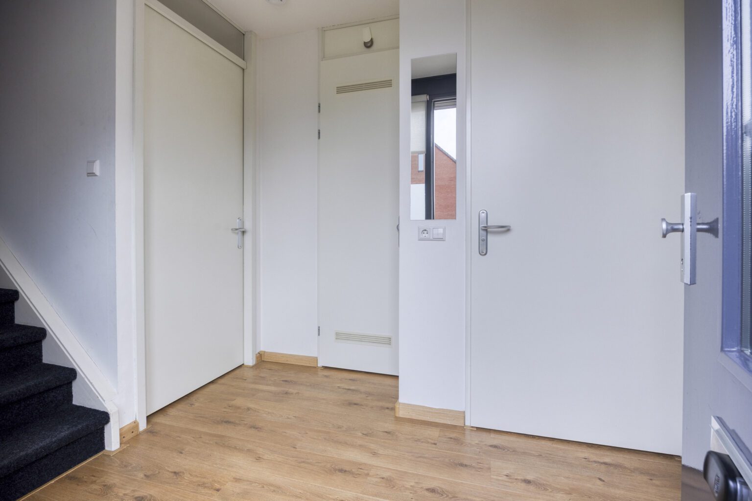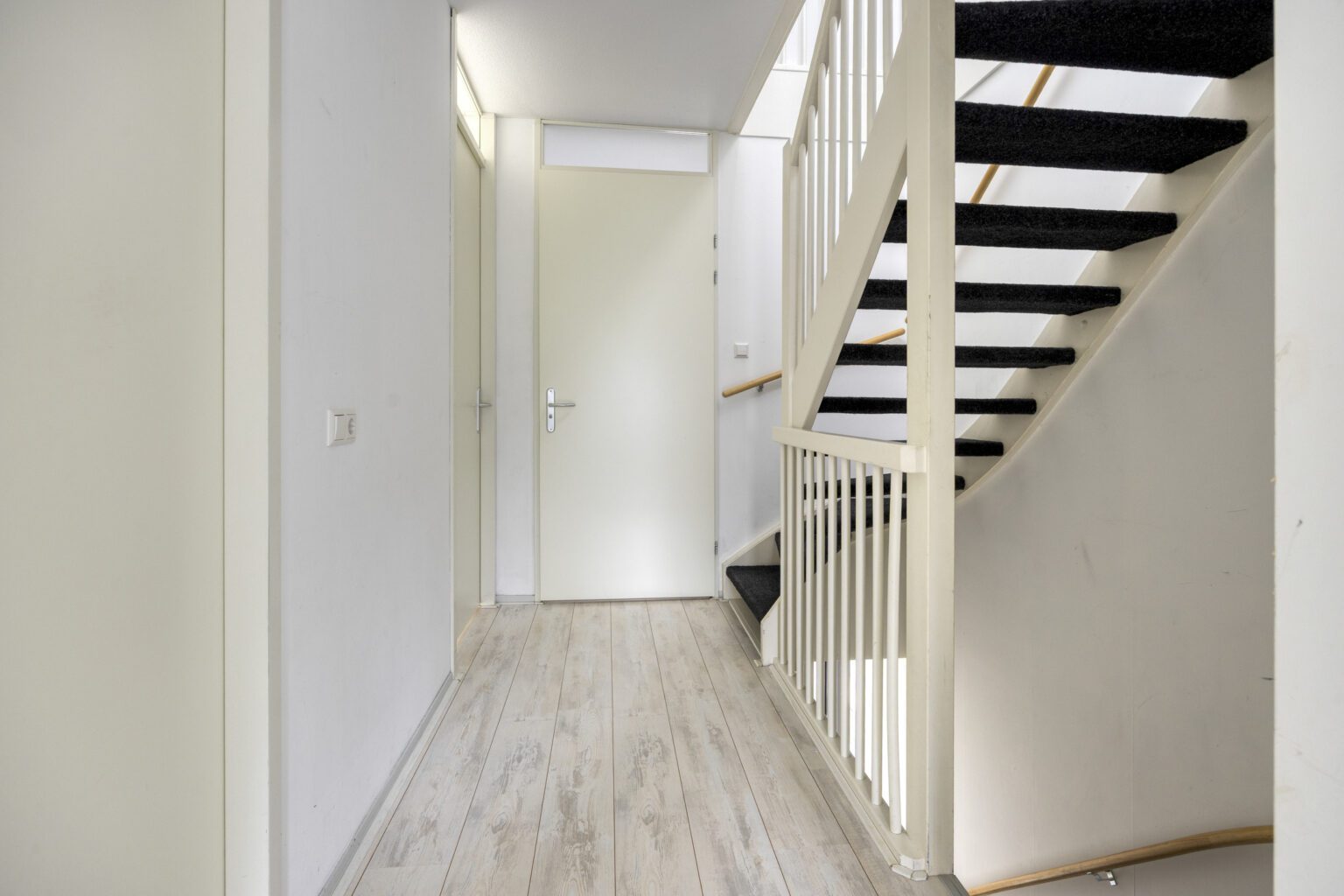 De voordeur bevindt zich aan de zijkant van de woning, wat zorgt voor extra privacy en een rustige entree. Parkeren doe je gemakkelijk aan de voorzijde. Eenmaal binnen kom je in de hal, waar voldoende plek is voor een garderobe. Het nette toilet met wandcloset is gunstig geplaatst, wat zorgt voor meer privacy en minder geluidsoverlast en de gestoffeerde trap naar de bovenverdieping bevindt zich eveneens in de hal.