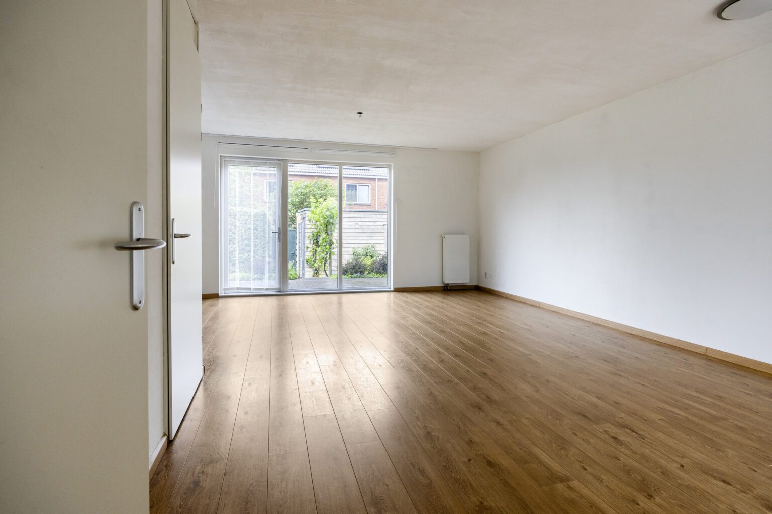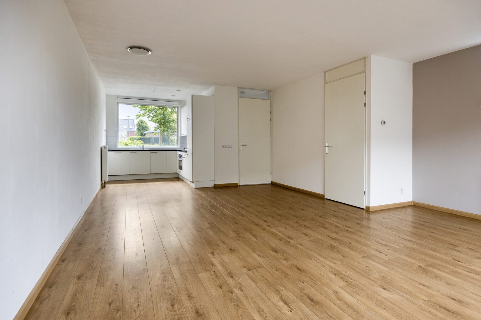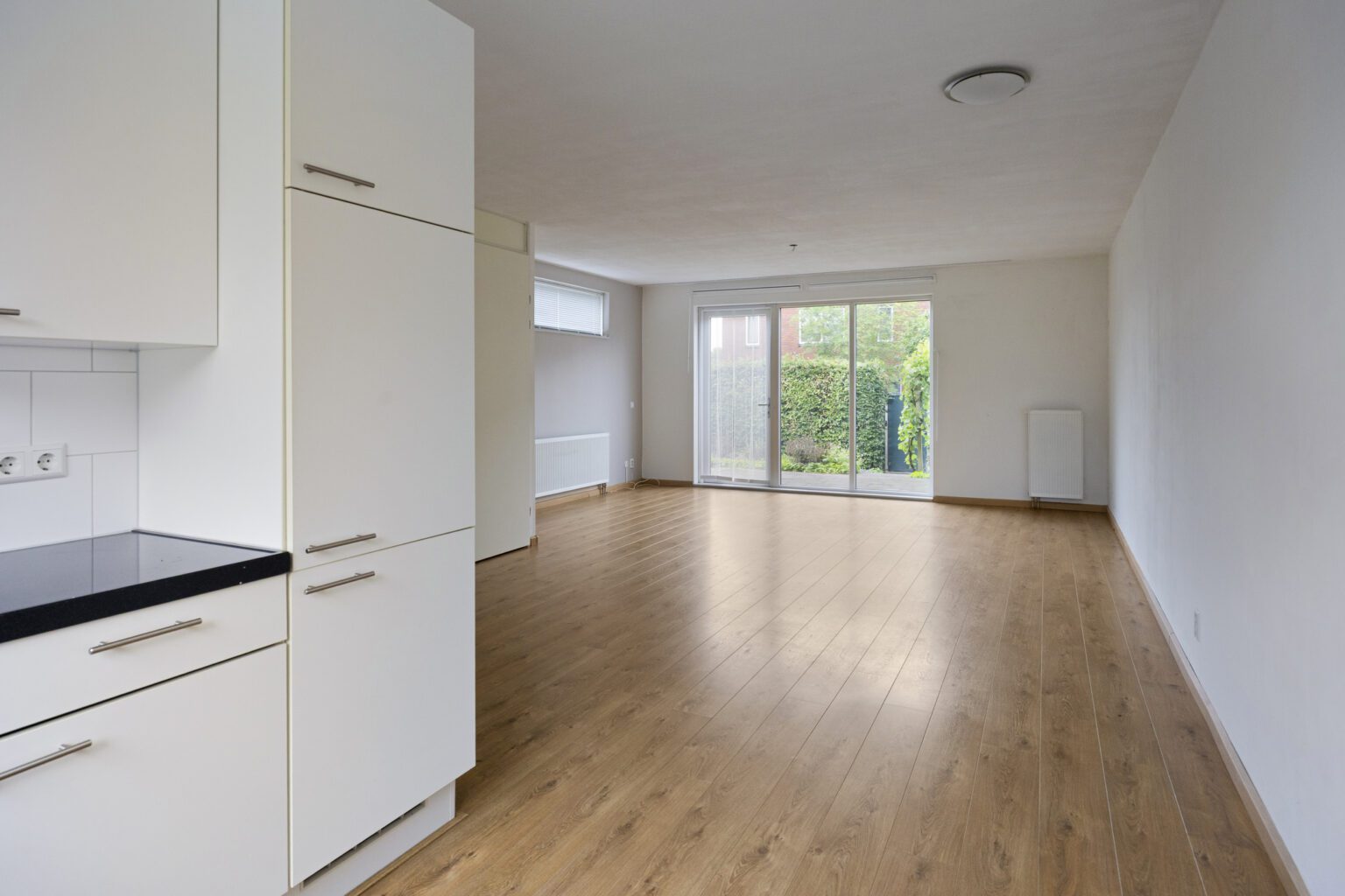 De riante woonkamer biedt verschillende indeelmogelijkheden. Wegens de vele ramen, komt er voldoende natuurlijk licht binnen. In de kamer is er voldoende ruimte voor een uitgebreide zithoek, waar je gemakkelijk een royale loungebank kunt plaatsen en met vrienden en familie kunt genieten van gezellige avonden. De praktische trapkast biedt voldoende ruimte voor bijvoorbeeld je schoonmaakspullen of voorraad. Tussen de keuken en de woonkamer is een mooie plek voor een grote eettafel waar je uitgebreid kunt dineren.