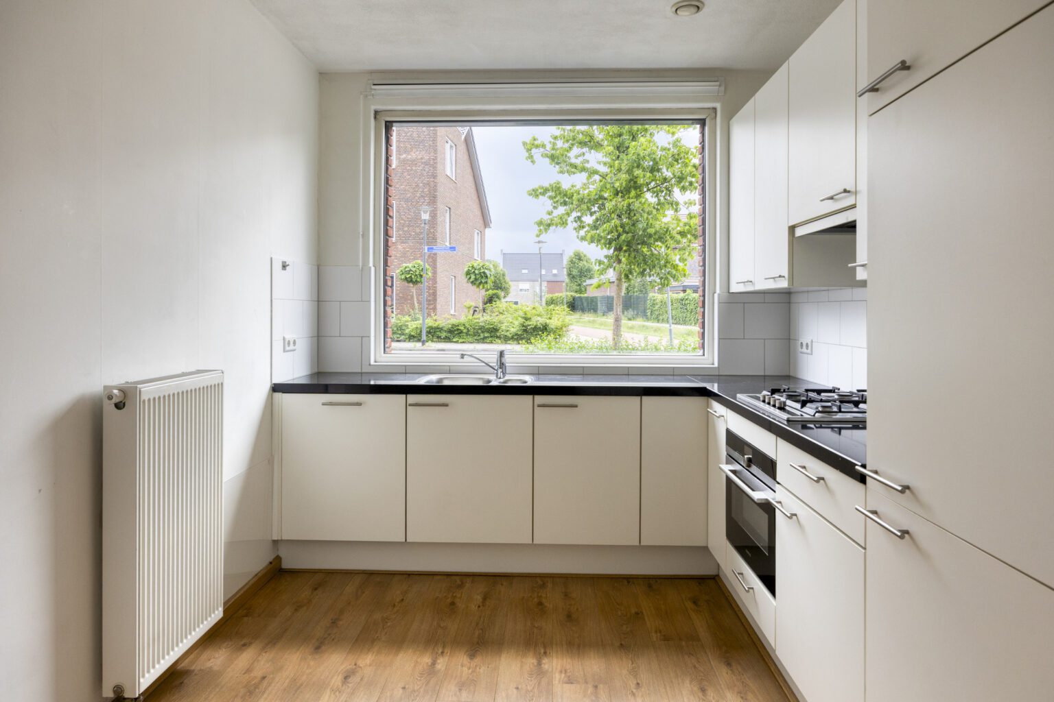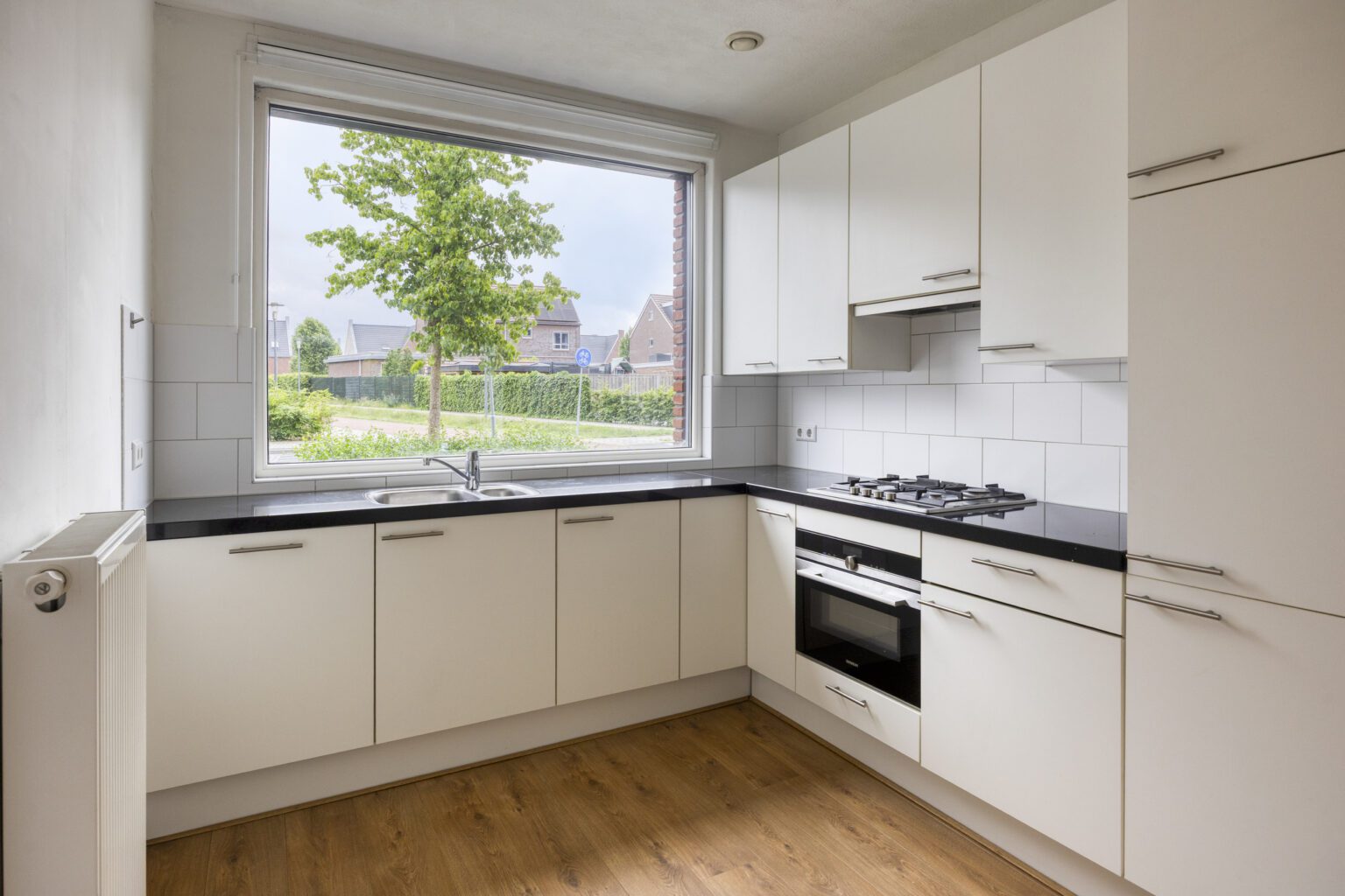 De hoekkeuken is voorzien van apparatuur zoals een oven, 4-pits kookplaat met afzuigkap, vaatwasser en een koel- en vrieskast. Er is voldoende plek op het natuurstenen blad om heerlijke maaltijden te bereiden, terwijl je vanuit de keuken fijn contact hebt met de straat. De vele kasten zorgen ervoor dat je je keukengerei gemakkelijk en overzichtelijk kunt opbergen.